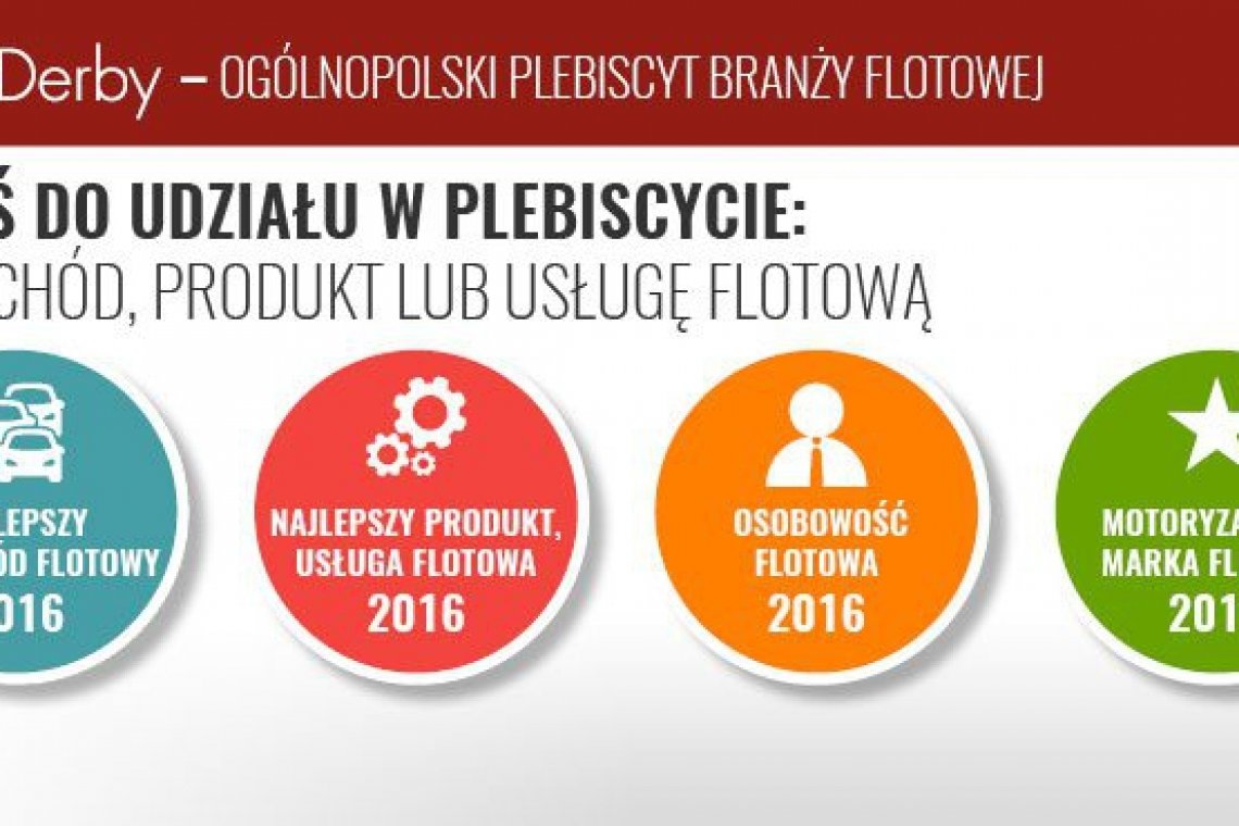 Fleet Derby, to coroczny, ogólnopolski plebiscyt internetowy, który ma na celu promować za pośrednictwem specjalnie dedykowanej strony internetowej www.fleetderby.pl produkty i usługi flotowe, motoryzacyjną markę flotową, osobowość flotową i najpopularniejszy samochód flotowy. Każda z firm, która weźmie udział w plebiscycie, otrzymuje jedyną w swoim rodzaju możliwość zaprezentowania własnej oferty przed decyzyjnymi na polskim rynku flotowym fleet managerami oraz ekspertami motoryzacyjnymi. Zgłoszenia do plebiscytu Fleet Derby 2016 przyjmowane są w kategoriach: