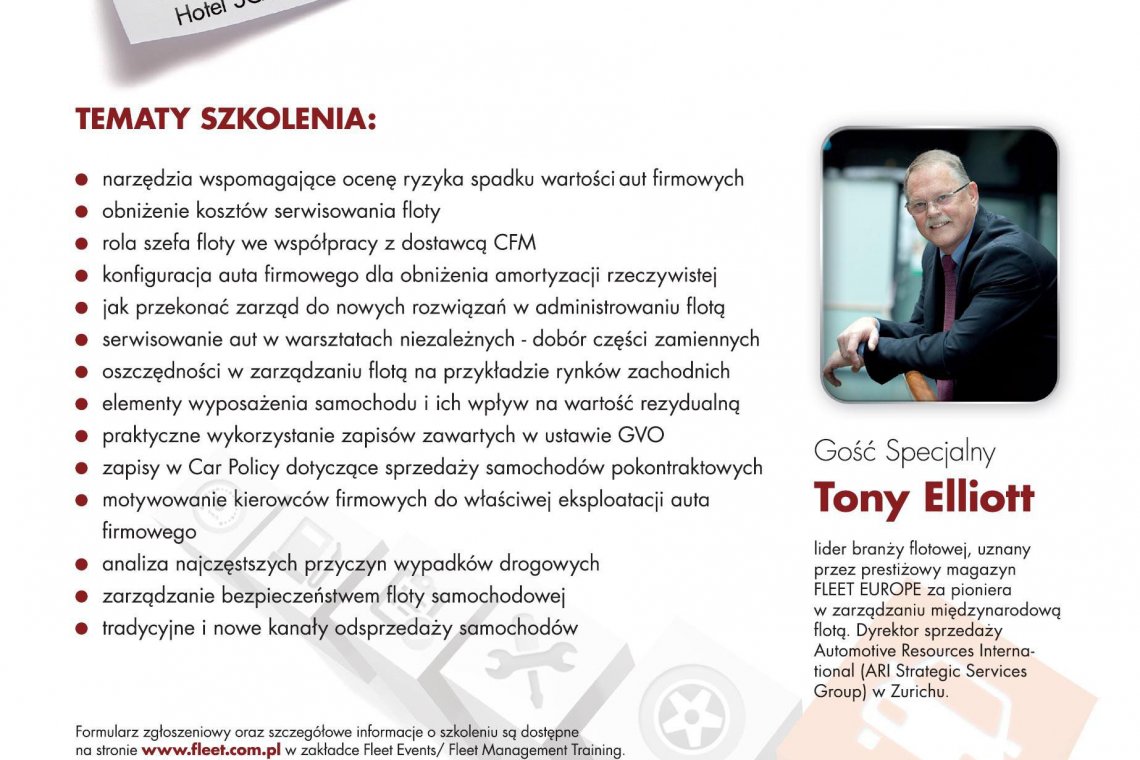Fleet Management Training to trzydniowe szkolenie skierowane do tych, którzy posiadają już dużą wiedzę z zakresu zarządzania flotami, ale wciąż są otwarci i chcą się uczyć. To specjalnie dla nich w tym roku zaprosiliśmy prelegenta z zagranicy. Wykład o praktykach w zarządzaniu flotami na dojrzałych rynkach poprowadzi Tony Elliott, członek Hall of Fame naszego partnera, magazynu Fleet Europe.