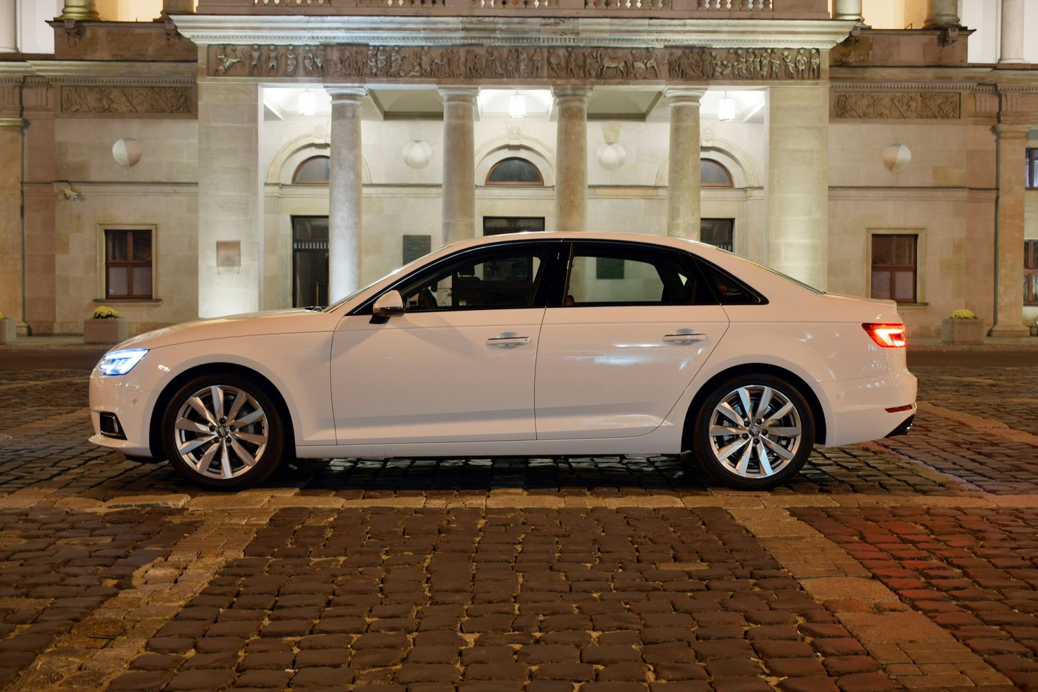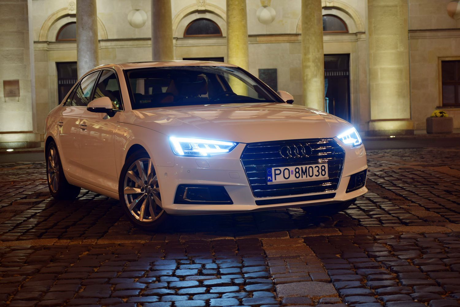 Nowa A-czwórka jest oferowana z jednym z trzech silników benzynowych: 1.4 TFSI/150 KM, 2.0 TFSI/190 KM oraz 2.0 TFSI/252 KM. Z czasem ofertę uzupełni sportowy model S4, pod którego maską pracuje 3-litrowy silnik V6 o mocy 354 KM. W ofercie znajdują się również cztery diesle: 2.0 TDI/150 KM, 2.0 TDI/190 KM, 3.0 TDI/218 KM oraz 3.0 TDI/272 KM. W przyszłości na rynku ma się pojawić model g-tron, napędzany gazem ziemnym. Producent oferuje A-czwórkę z klasyczną 6-biegową przekładnią manualną, siedmiostopniową skrzynią S Tronic lub też z ośmiostopniową skrzynią automatyczną Tiptronic. Jednym z chętniej wybieranych wariantów będzie testowany model z 2-litrowym dieslem o mocy 190 KM (ceny od 163,47 tys. zł). Osiąga on maksymalny moment obrotowy 400 Nm w zakresie 1750–3000 obr./min. A-czwórka z tym silnikiem przyśpiesza od 0 do 100 km/h w 7,7 sekundy i rozpędza się aż do 237 km/h. Są to więc osiągi więcej niż znakomite i aż trudno uwierzyć, że w tym zakresie w ofercie Audi A4 silnik ten jest przeciętniakiem. Niemieckiego sedana docenimy również za znakomite wyciszenie na poziomie topowych aut segment wyższych, w czym m.in. zasługa dźwiękoszczelnych opcjonalnych szyb. Przy spokojnej jeździe uwagę zwraca bardzo wydajna funkcja wolnego biegu, dzięki której po odpuszczeniu pedału gazu możemy sunąć na zaskakująco duże odległości bez spalania grama paliwa. Zresztą jak na tak duży pojazd i znakomite osiągi zużycie paliwa w nowym A4 jest minimalne. Podczas spokojnej jazdy w trasie bez problemów osiągaliśmy wynik na poziomie 4,6 l/100 km. W mieście zużycie rosło do ok. siedmiu litrów.