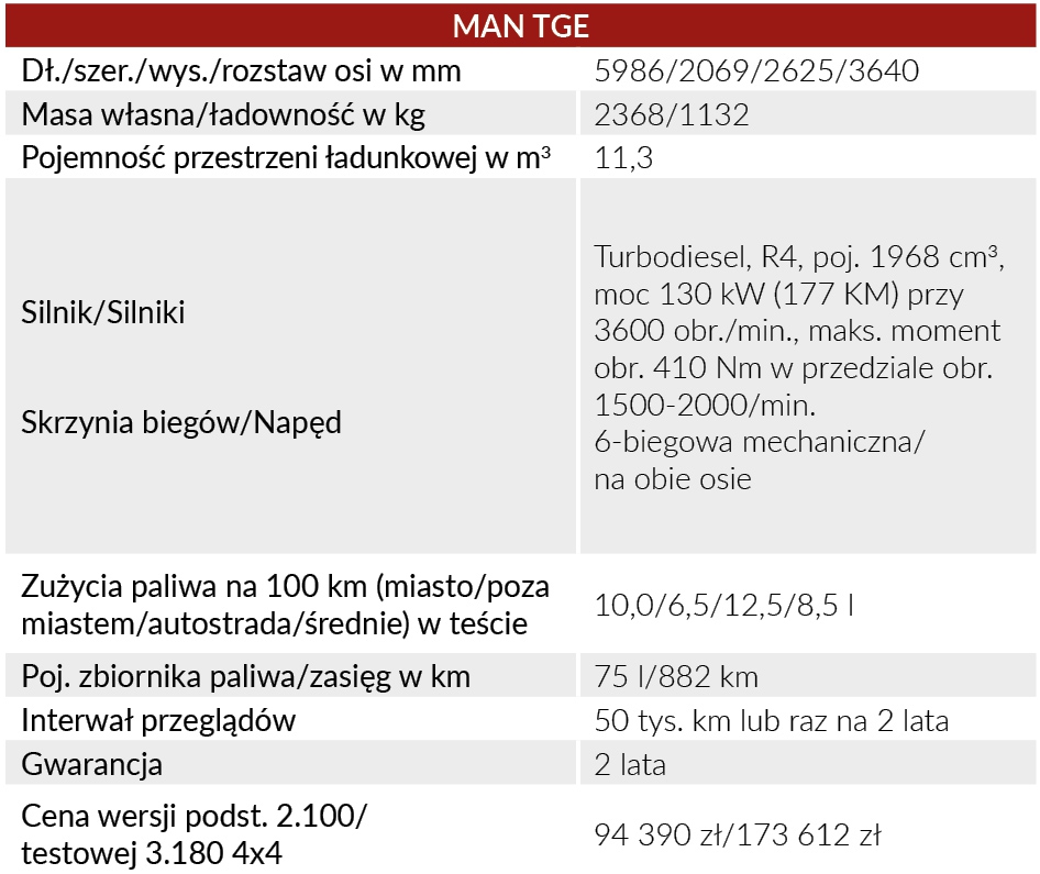 Samochód taki jak testowy jest wręcz wymarzony do zaopatrywania schronisk górskich czy gospodarstw agroturystycznych, które znajdują się daleko od asfaltowych dróg. Takiego auta nie zaskoczą błoto, koleiny oraz opady śniegu. To znakomity kompan dalszych i bliższych podróży. Potencjalnego nabywcę teoretycznie może zniechęcić cena. Dlaczego teoretycznie? Jak zapewniają przedstawiciele MAN w Polsce, cena każdego egzemplarza jest ustalana indywidualnie. Oficjalny cennik nie istnieje, dlatego prezentowane w tabeli (poniżej ceny) są jedynie punktem wyjściowym do rozmowy. Klient wierny marce MAN pozostanie przy MAN-ie. To samo dotyczy tych, którzy mają w planach zbudowanie większej floty opartej m.in. na modelu TGE.
