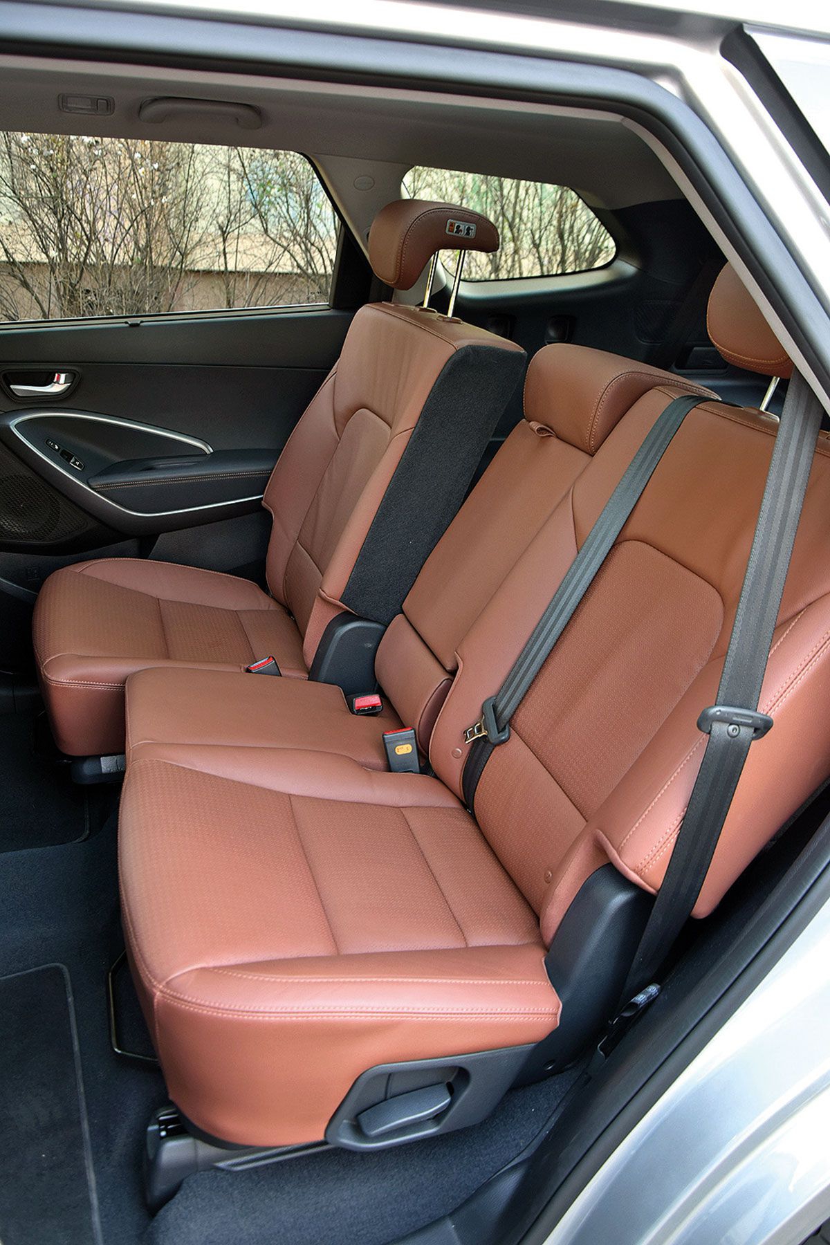 Wnętrze i aranżacja deski rozdzielczej przypomina inne współczesne modele Hyundaia. Elegancji kabinie dodają chromowane wstawki, dobrej jakości różnokolorowe tworzywa oraz gustownie prezentujący się zestaw zegarów. Gdy usiądziemy na fotelu, wita nas miły dźwięk. Podobny dźwięk usłyszymy w momencie zgaszenia silnika. Ten drobiazg znany z innych modeli Hyundaia podświadomie wpływa na lepsze postrzeganie modelu i czyni go w naszym umyśle bardziej ekskluzywnym. Producent zadbał o to, aby pod względem ergonomii również nie było się do czego przyczepić. Wszystkie elementy obsługi i przyciski są ulokowane tam, gdzie ich oczekujemy. Kolorytu wnętrzu Grand Santa Fe dodają również brązowo-pomarańczowe skórzane fotele, w których, oczywiście, oprócz pełnej elektrycznej regulacji znajdziemy funkcje ogrzewania i wentylacji siedzisk. Nie zabrakło ich również w drugim rzędzie. Fotele te są wygodne i oferują lepsze niż we wcześniejszych koreańskich SUV-ach wyprofilowanie. W pierwszym i drugim rzędzie z pewnością nie będziemy narzekać na brak miejsca. Kanapa w drugim rzędzie ma dzielone oparcie i siedzisko w proporcji 1/3–2/3. Co więcej, obie te części można niezależnie pochylać i przesuwać niczym w rodzinnych vanach. Nisko położone siedzisko w trzecim rzędzie sprawia, że pasażerowie muszą w nienaturalny sposób podkulać nogi w czasie jazdy. Za to miejsca na boki nie brakuje. Również nad głowami znaleźlibyśmy kompakty, które oferują mniej przestrzeni w trzecim rzędzie. Co więcej, producent pomyślał o montażu nadmuchów dla pasażerów trzeciego rzędu, ale i niezależnej regulacji siły nawiewu i temperatury. Ten element bywa często pomijany przez konstruktorów innych marek. Przy pięciorgu pasażerów mamy jeszcze do dyspozycji bagażnik o pojemności 634 litrów (w krótszym modelu jest to 585 litrów), który po opuszczeniu oparć kanapy powiększa się do 1842 litrów. Zwykły Santa Fe oferuje 1680 litrów. W bagażniku praktycznym dodatkiem jest gniazdko 220 V.