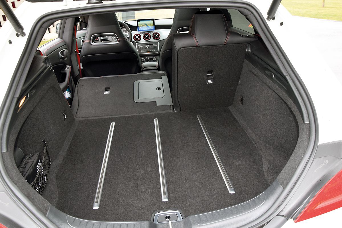 Kombi Mercedesa wykorzystuje płytę podłogową znaną z klasy A. Ma ten sam rozstaw osi wynoszący 270 cm, a dodatkowe 34 centymetry znajdziemy jedynie na tylnym zwisie. Samochód ma długość 463 cm, czyli taką jak wariant czterodrzwiowy. Kompaktowy Shooting Brake przyciąga uwagę wyrazistymi i dynamicznymi kształtami nadwozia. I co ważne, jest od swojego czterodrzwiowego brata bardziej proporcjonalny. Wygląd nowego modelu budzi skojarzenia ze znacznie większym CLS-em. Priorytetem twórców wariantu CLA Shooting Brake była stylistyka a nie praktyczność, na co wskazuje np. mocno opadająca ku tyłowi linia dachu oraz klapa tylna ustawiona pod bardzo dużym kątem. Wróży to niewielką kubaturę ładunkową i małą przestrzeń dla pasażerów z tyłu. Bagażnik w nowym wariancie jest niewiele większy niż w klasycznym CLA – 495 litrów to o 25 l więcej niż w sedanie. Wyraźnie jednak Shooting Brake zyskuje jeśli złożymy oparcia foteli w drugim rzędzie. Wówczas do dyspozycji mamy 1354 litry oraz płaską powierzchnię przewozową. Jak na kombi segmentu C jest to wynik skromny. Szkoda też, że dolna krawędź załadunku jest zbyt wąska. Warto dodać, że producent zamontował bezramkowe drzwi, które dotąd były przywilejem głównie dwudrzwiowych samochodów coupé.