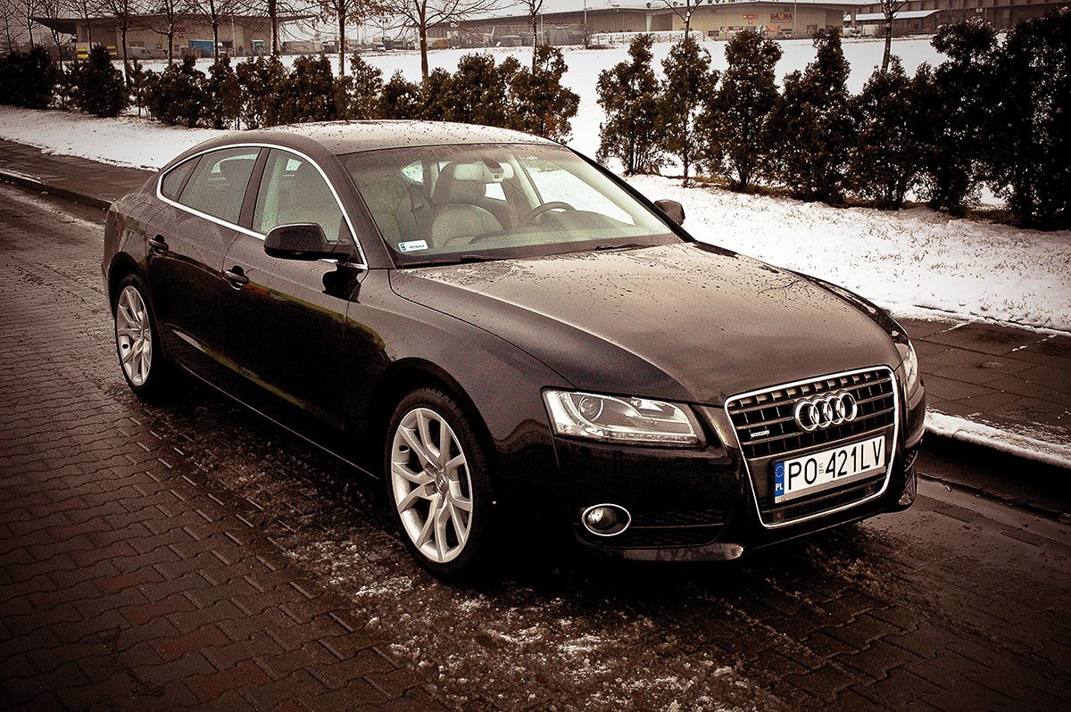 ...czyli jak się samochód prowadzi w praktyce. A tutaj najważniejszym słowem będzie „Quattro”, czyli prawdziwy napęd na cztery koła. Dlaczego tak to podkreślam? Ponieważ jest to coś, czego, moim zdaniem, bardzo brakuje na obecnym rynku samochodów – napęd 4x4 wydaje się być zarezerwowany dla aut stricte sportowych typu Subaru Impreza STI albo aut do ciężkiego off-roadu. Natomiast osoby zainteresowane czymś bardziej komfortowym i, a jednocześnie z napędem na cztery koła, są skazane na SUV-y z ich dziwacznymi niby 4x4. Audi jest w tej kwestii wyjątkiem – jako jedna z niewielu firm daje nam możliwość zakupu normalnego auta z prawdziwym napędem na cztery koła. A to nie lada gratka i nikomu, kto zna rozkosz posiadania mocy na obu osiach, nie trzeba tego tłumaczyć – to zupełnie inny poziom przyjemności z prowadzenia auta, ale też dużo większe bezpieczeństwo. Sytuacje, które dla aut przednio- lub tylnonapędowych są już beznadziejne, dla posiadaczy czterech napędów są jeszcze do uratowania. Jeśli ktoś z tego wszystkiego, co piszę, odniósł wrażenie, że A5 Sportsback Quattro to nie jest auto do normalnej jazdy, od razu prostuję – obok całego swojego drapieżnego charakteru, jest to bardzo przyjemne i komfortowe auto do codziennego poruszania się. Dużo miejsca w środku, całkiem niemały bagażnik, wygodna pozycja za kierownicą i dobre pole widzenia – Audi A5 to jednak przede wszystkim limuzyna i jazda nią jest naprawdę przyjemna. Warto też dodać, że – mimo iż jest dość niskie – nie ma żadnych problemów z krawężnikami lub na nieutwardzonej nawierzchni. Choć zawieszenie ma naprawdę sportowe parametry. Jedyny problem przy codziennej jeździe A5 Sportback – zbyt łatwo zebrać nowe punkty karne.