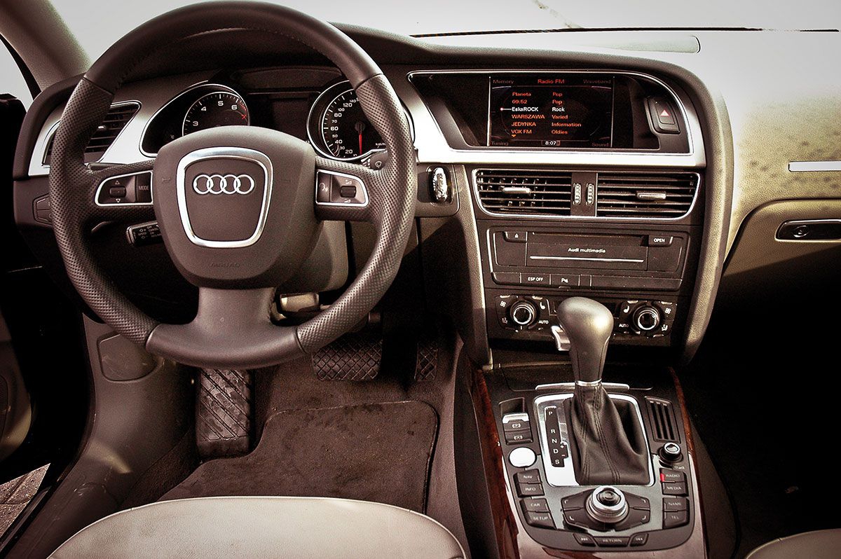 ...czyli najpierw rzut oka z zewnątrz. A jest na co popatrzeć – Audi A5 Sportback nie jest samochodem, obok którego przechodzi się obojętnie. Z jednej strony ma w sobie wszystkie cechy eleganckiej limuzyny, ale jest w nim coś, co mówi wyraźnie, że to auto nie zamierza być grzeczne. Mimo że A5 nie jest mała, konstruktorom udało się sprawić wrażenie, że jest tylko troszkę większa od Carrery i niewiele mniej sportowa. W środku już zdecydowanie bardziej elegancko niż sportowo – żadnych spartańskich warunków rodem z WRC: wygodnie, komfortowo, elegancko. A5 Sportback nie musi stylizować się na sportowe auto dodatkami. Dyskretny napis „Quattro” nad schowkiem znaczy o wiele więcej niż czcza stylistyka w rodzaju białych zegarów. Warto tutaj jeszcze wspomnieć o szybach bez górnej ramy, które również zwracają na siebie uwagę, podkreślając że jest to ponad wszelką wątpliwość auto z wyższej klasy.