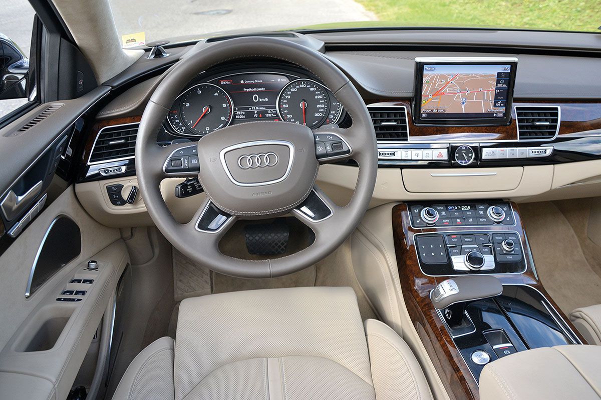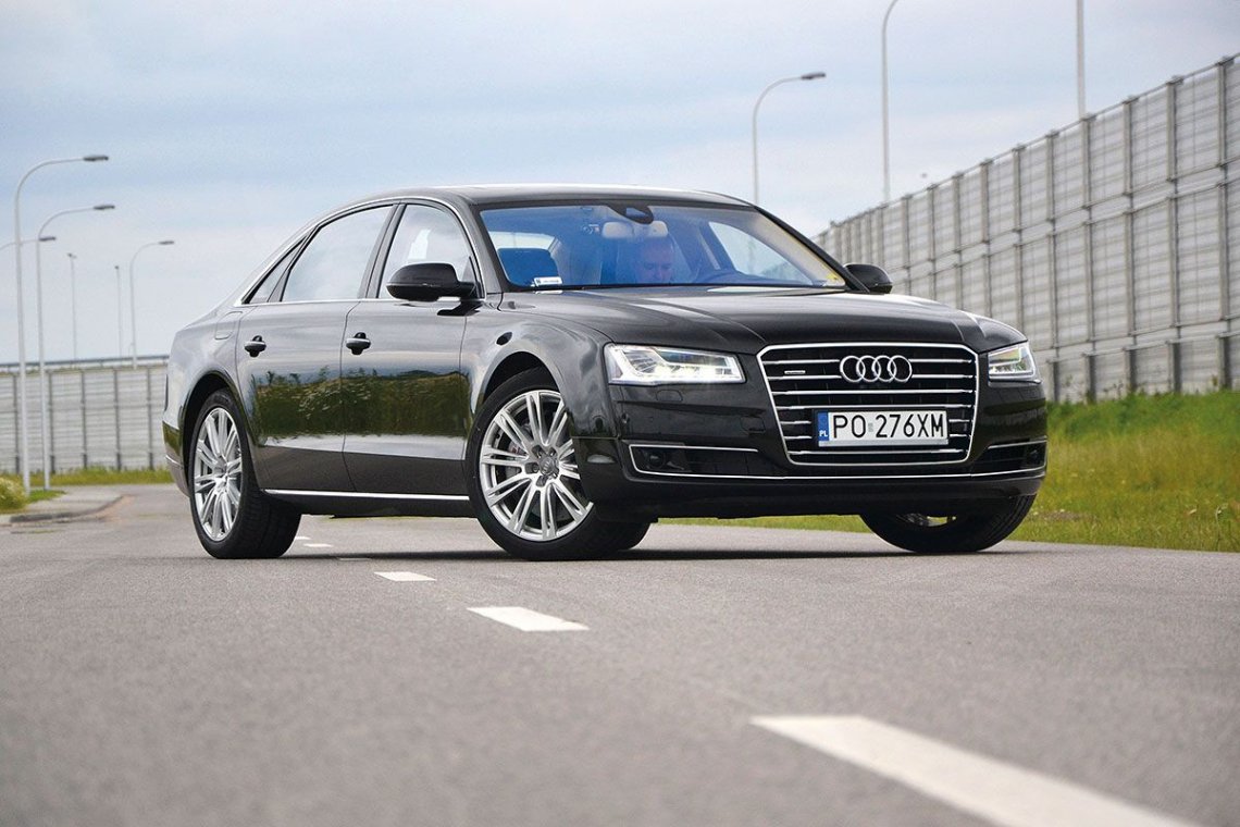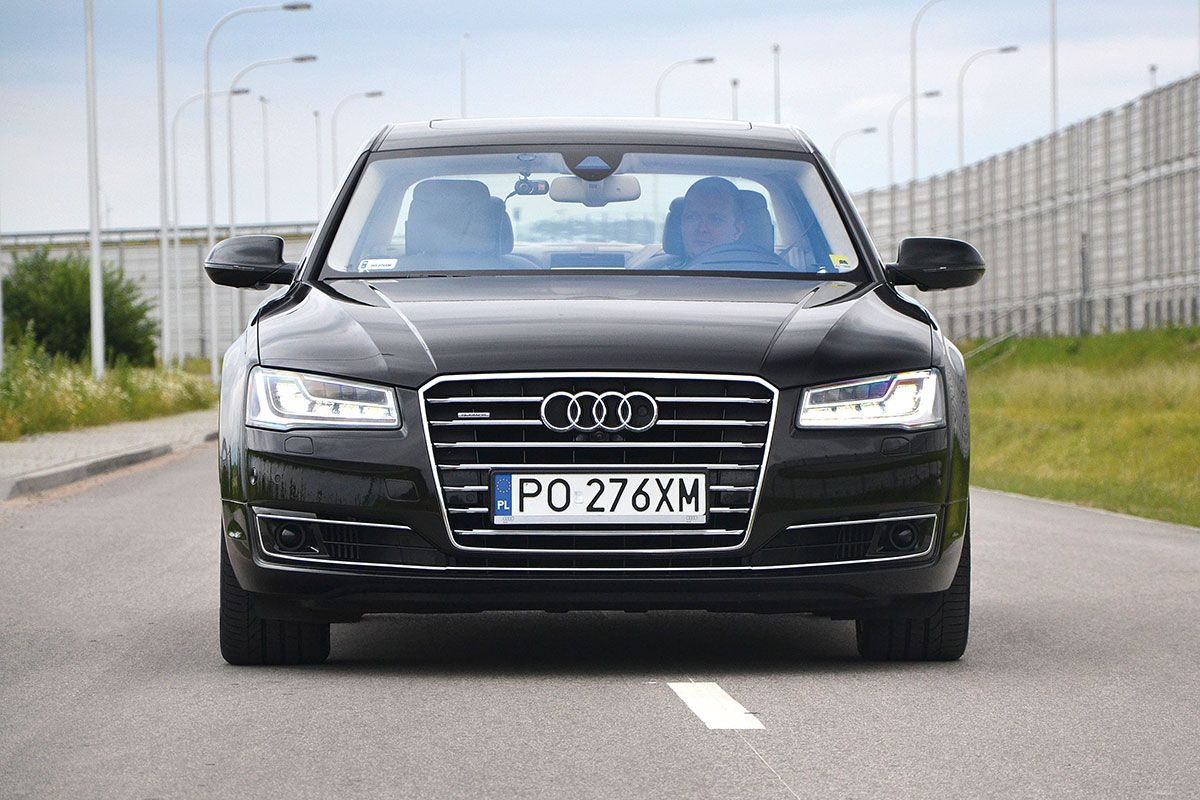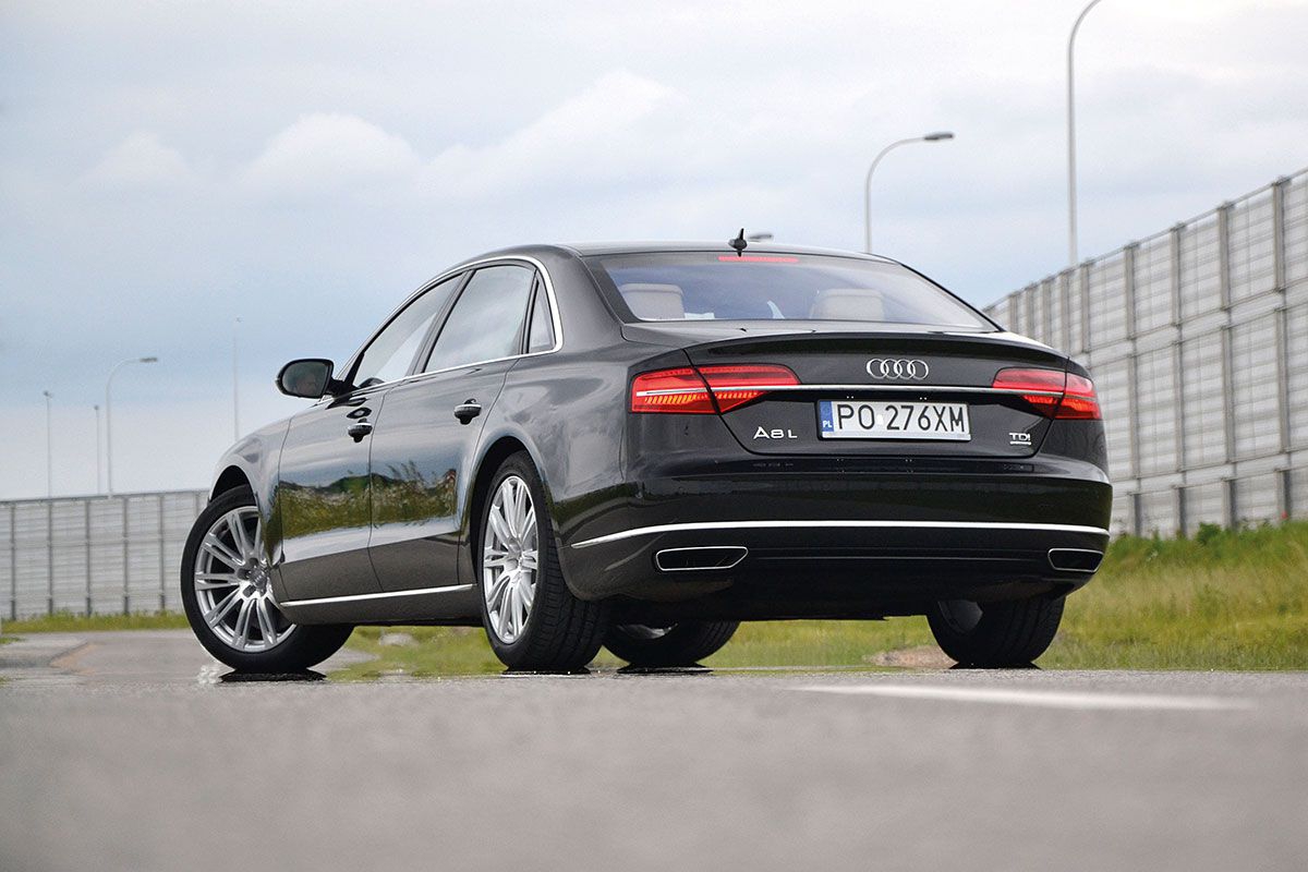 Sama podróż modelem A8 jest przyjemnością niezwykłą, tak za kierownicą, jak i na tylnej kanapie. Dwutonowa, pięciometrowa limuzyna prowadzi się z dziecinną łatwością. Samochód jakby wbrew prawom fizyki pokonuje kolejne coraz ciaśniejsze zakręty, nigdy nie zdradzając nerwowości. Duża w tym zasługa stałego napędu na cztery koła (rozdzielanego w proporcjach 60% na tył i 40% na przód) z klasycznym centralnym mechanizmem różnicowym. Prowadzenie jest perfekcyjne w każdym z pięciu trybów jazdy Audi drive select. Zmienia się w nich tylko charakterystyka pracy silnika, siła wspomagania kierownicy, sztywność zawieszenia i prześwit (maksymalnie o 2 cm). Mimo pokaźnej długości, zza kierownicy nie czujemy rozmiarów samochodu. W sytuacji kryzysowej, np. na ciasnych parkingach, przychodzą nam z pomocą kamery, których obraz wyświetlany jest na centralnym wyświetlaczu.