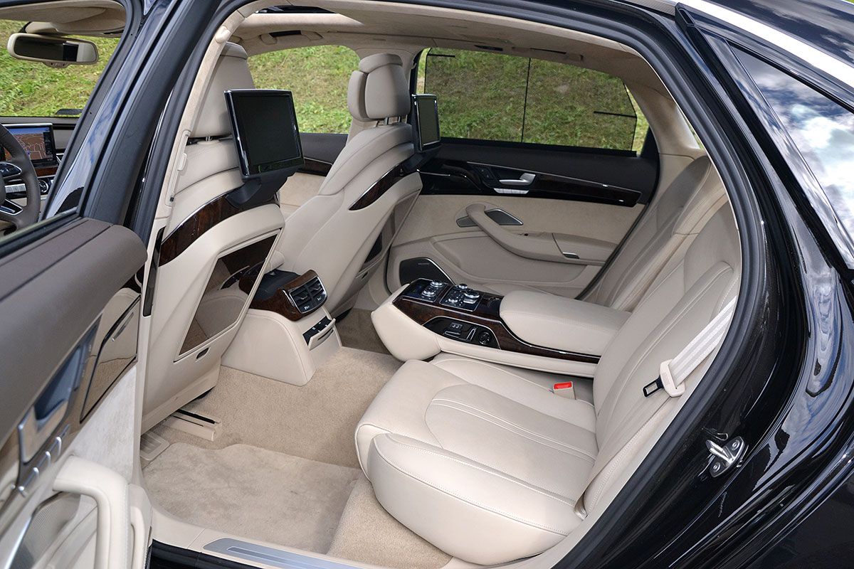 Najwygodniej na tylnej kanapie podróżuje się we dwójkę. Wówczas ze środkowego oparcia można zrobić wygodny podłokietnik, na którym umieszczono bogaty system sterowania, m.in. klimatyzacją, funkcjami masażu, ogrzewania i nawiewów, ustawieniami kanapy, o wcale nie mniejszym zakresie niż fotele przednie. Za pomocą panelu na podłokietniku lub pilota możemy też wybierać kanały telewizyjne lub filmy, które następnie wyświetlane są na ekranach LCD zamontowanych na tylnej stronie zagłówków przednich foteli (opcja). Aby nie rozpraszać kierowcy, pasażerowie z tyłu mogą korzystać z firmowych słuchawek. Zresztą nagłośnienie zastosowane w modelu A8 jest klasą samą w sobie. Jakość dźwięku z systemu nagłośnienia Bang & Olufsen, złożonego z 19 głośników o łącznej mocy 1400 W, docenią nawet wybredni audiofile. W niemieckiej limuzynie możemy liczyć na dużą intymność, nie tylko dzięki przyciemnianym szybom, ale i automatycznie wysuwającym się roletom w drzwiach i przy tylnej szybie.