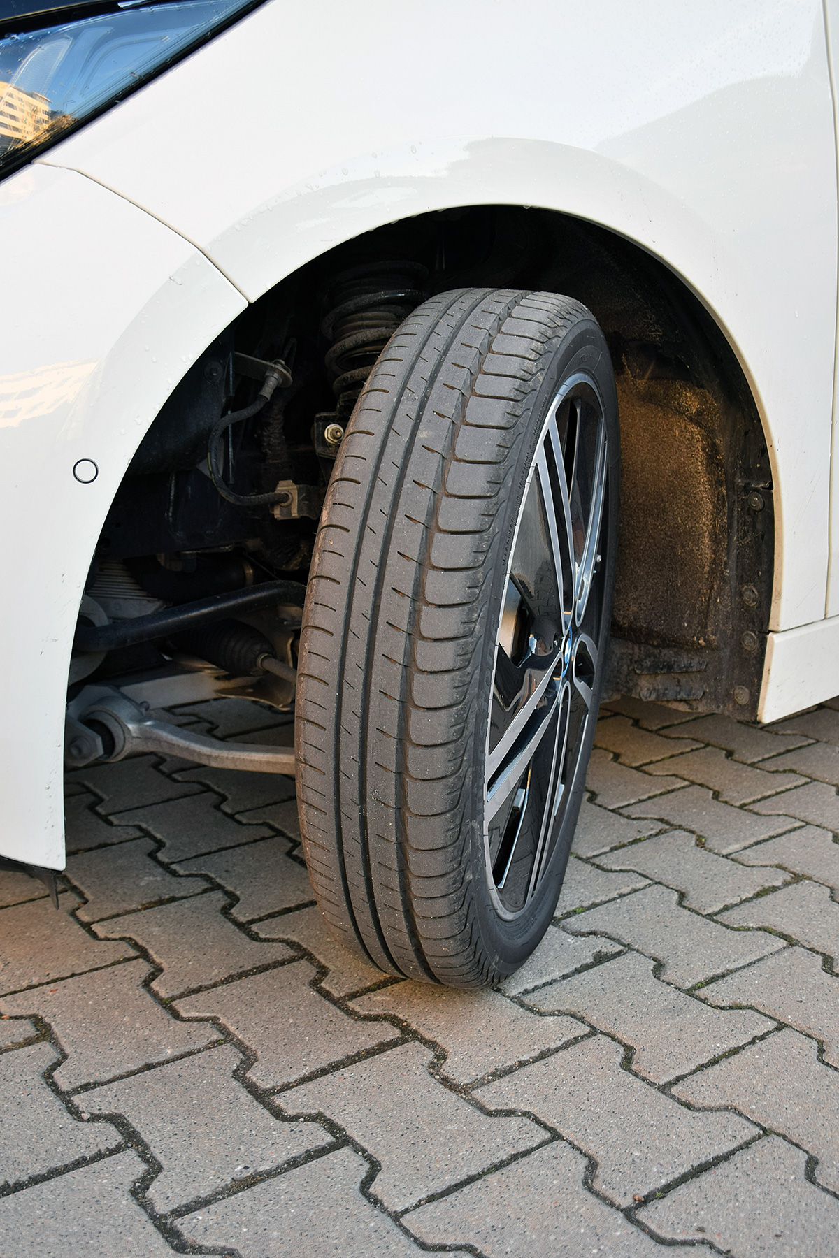 Standardem w modelu i3 są efektowne 19-calowe felgi aluminiowe (w opcji są jeszcze dwudziestki), jednak zaskoczeniem może być zastosowanie bardzo wąskich opon o szerokości ledwie 15,5 cm. Wyglądają one dziwacznie w momencie skrajnego skrętu kół. Mają one jednak praktyczne zalety. Węższe koło zwykle oznacza mniejsze opory toczenia oraz mniejszą średnicę zawracania (ok. 10 m), które w tym aucie jest niewielka również ze względu na tylny napęd (brak elementów napędowych z przodu, które ograniczałyby skręt kół).