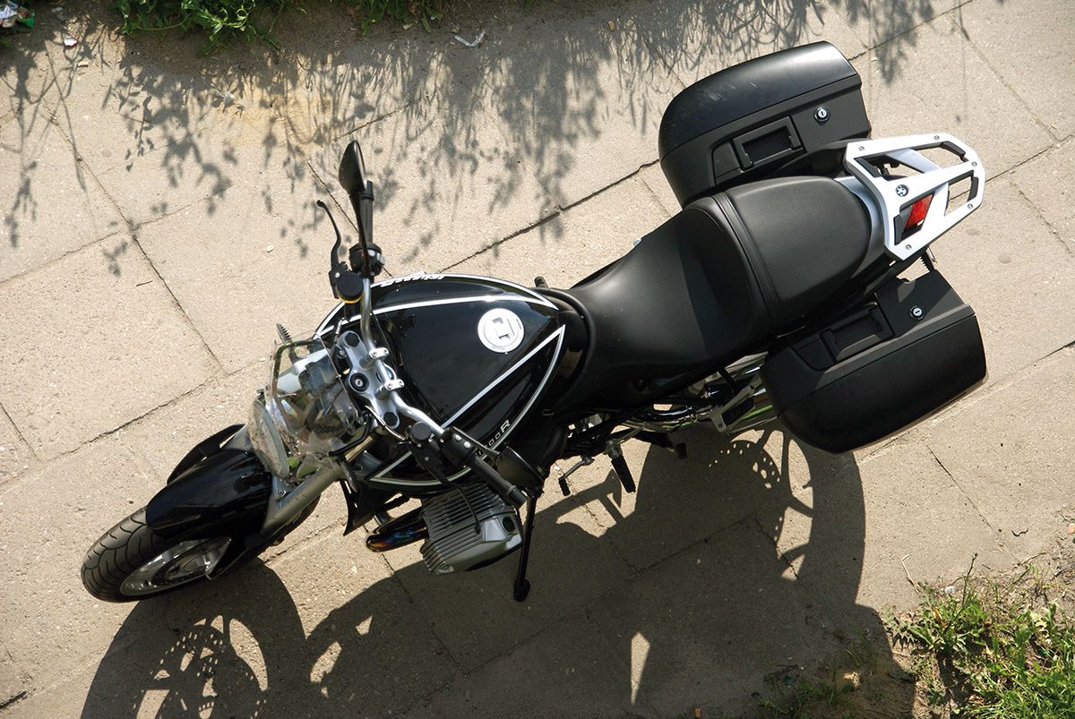 Czerń lakieru testowego egzemplarza świetnie skomponowano ze stalowoszarym układem napędowym z dwoma cylindrami o stosunkowo dużej pojemności. Tutaj należą się brawa dla stylistów za udany zabieg wyeksponowania silnika jako głównej atrakcji niemieckiego big bike’a. Maszyna ma przy tym zachowane proporcje, a wyposażenie dodatkowe w postaci kuferków dodało jej również dalekobieżnego charakteru. Bliższe oględziny motocykla ujawniają jego wąskie wcięcie w miejscu zajmowanym przez kierowcę, bo cylindry sprawiają wrażenie szerszych od kierownicy. Na szczęście, to tylko złudzenie, które raczej nie powinno popsuć radości przeciskania się w korkach między samochodami. Pierwsze wrażenie jest zaskakująco pozytywne. BMW wydaje się być lżejsze niż jest w rzeczywistości. Pozwala na dziecinnie łatwe manewrowanie na parkingu, zarówno do przodu, jak i do tyłu. Ogromnym ułatwieniem jest profil siedzenia zapewniający znakomite podparcie dla ud kierowcy podczas cofania. Do tego regulacja wysokości motocykla, której pokrętło umieszczono pod siedziskiem, to niezwykle przydatny gadżet. Z kolei geometria przedniego zawieszenia umożliwia niewielki promień skrętu. Kto miał do czynienia z zawracaniem załadowanym motocyklem na wąskiej drodze, wie, jak bardzo jest to istotne.