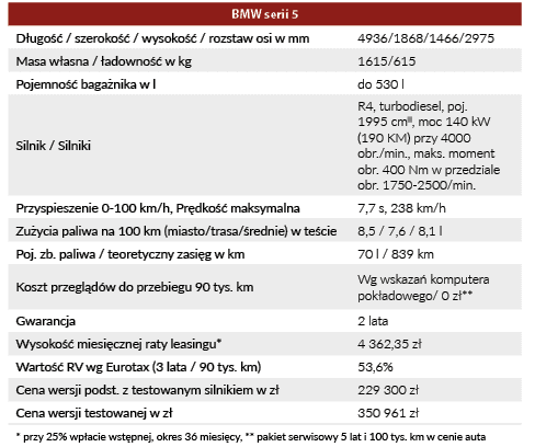 Pod maską naszej „piątki” zamontowany był 2-litrowy turbodiesel o mocy 190 KM. Zapewne podobnie jak w przypadku poprzednich generacji tego modelu, będzie to najczęściej wybierany silnik, zarówno przez klientów flotowych, jak i indywidualnych. Auto z tą jednostką napędową nie jest może rakietą, ale jak na możliwości 2-litrowego diesla jest szybkie. Już od 1750 obr./min na rozkazy czeka siła napędowa o wartości 400 Nm, która dzięki znakomitej 8-biegowej przekładni automatycznej Steptronic niemal non stop jest do dyspozycji kierowcy. Reakcja na gaz jest bardzo dobra, a sama skrzynia tak samo dobrze pracuje w trybie automatycznym oraz tzw. ręcznym. Nawet z tym podstawowym silnikiem „piątka” daje ogromną przyjemność z jazdy i pokazuje, że ma charakter, oraz że to prawdziwe BMW z krwi i kości. Te cechy sprawiają, że za kierownicą trudno jest zachować rozsądek i umiar, czego odzwierciedleniem są wyniki zużycia paliwa. Głaszcząc pedał gazu, można zejść do 6,5 l/100 km. Bardziej jednak zaskoczyło nas to, że przy bardzo szybkiej jeździe autostradowej spalanie nie przekroczyło 10 l/100 km. W mieście uzyskane przez nas 8,5 l na setkę też uznajemy za przyzwoite, choć w konfrontacji z fabrycznymi danymi dotyczącymi spalania, rozbieżności sięgają aż 50% i są po prostu zbyt duże.