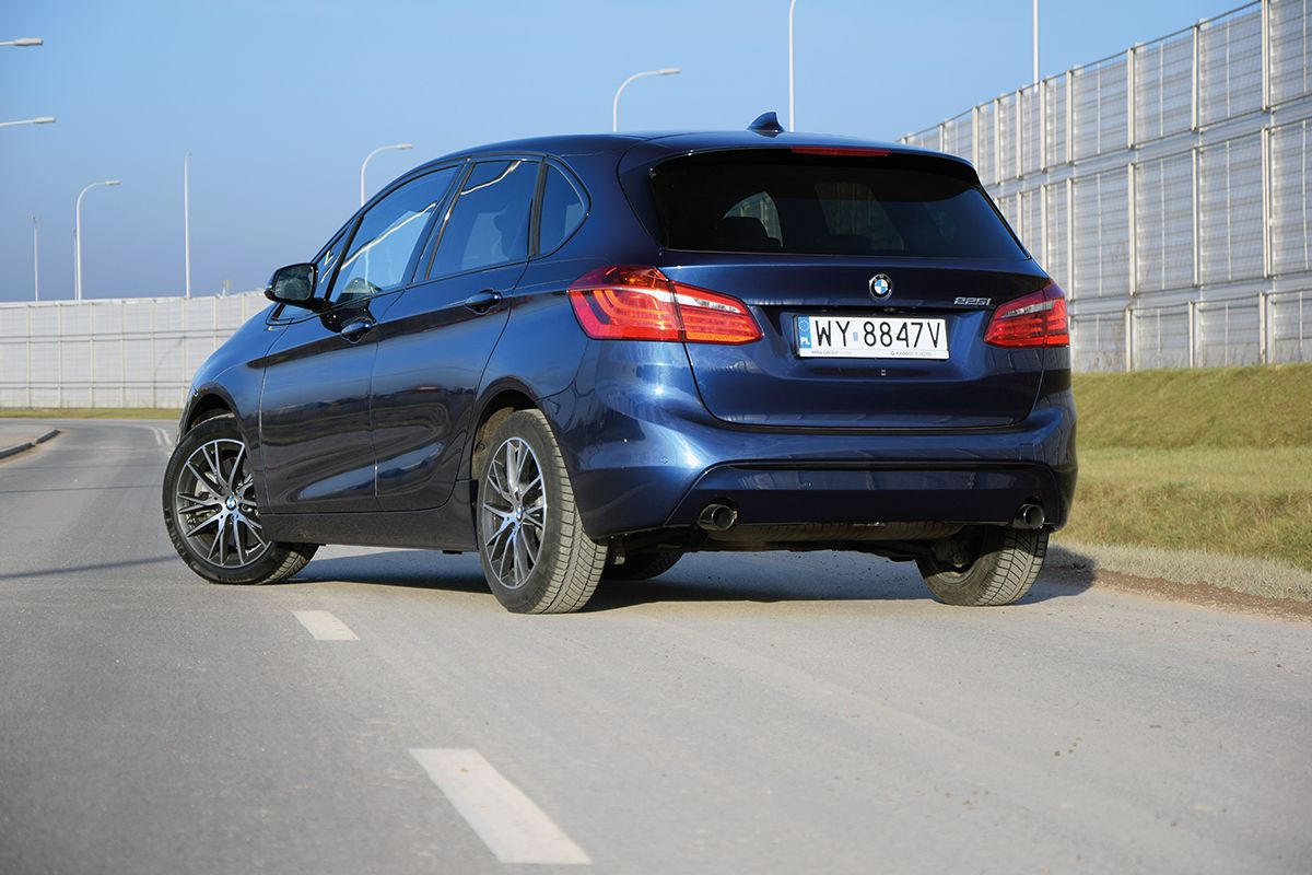 Konstruktorzy układu jezdnego w nowym BMW wykonali kawał dobrej roboty. Active Tourer może się pochwalić znakomicie zestrojonym zawieszeniem i perfekcyjnym prowadzeniem w zakrętach. Mimo sporej wysokości nadwozia i przedniego napędu, wychylanie się nadwozia w czasie jazdy po łukach oraz zjawisko podsterowności są w tym modelu obce nawet podczas gwałtownych manewrów. Wrażenie robi także precyzja sportowego układu kierowniczego (opcja). Oczywiście, możemy zmieniać tryby jazdy, które wyraźnie wpływają na zachowanie samochodu. W naszym odczuciu nie ma obecnie na rynku minivana, który jeździłby równie dobrze. Nie ma również minivana o lepszych osiągach. Dwulitrowy turbodoładowany silnik benzynowy o mocy 231 KM w parze z japońską ośmiobiegową automatyczną skrzynią biegów Aisin tworzą zgrany tandem. Skrzynia nie pracuje tak szybko i pewnie jak automat ZF montowany w innych BMW, ale trudno mieć większe zastrzeżenia. Jednostka napędowa osiąga maksymalny moment obrotowy 350 Nm w zakresie 1250‒4500 obr./min dzięki czemu właściwie w każdym momencie możemy liczyć na znakomite przyśpieszenia. Ten półtoratonowy samochód rozpędza się do setki w 6,6 sekundy i może maksymalnie osiągnąć prędkość 240 km/h. Nawet podróż w pięć osób z bagażami nie wpływa na pogorszenie osiągów. Potężny zapas mocy może się przydać do szybkiego i bezpiecznego wyprzedzania innych pojazdów podczas rodzinnych eskapad. Zużycie paliwa jest w tym modelu dość umiarkowane. W ruchu miejskim Active Tourer spalał ok. 9 l/100 km, a w trasie przy nieśpiesznej jeździe zużycie benzyny spadało do ok. sześciu litrów. Warto dodać, że producent zadbał o znakomite wyciszenie. Silnik po włączeniu nie jest w ogóle słyszalny, a przy prędkościach powyżej 130 km/h spod maski dobiega jedynie szmer znacznie cichszy niż szum powietrza opływającego nadwozie.
