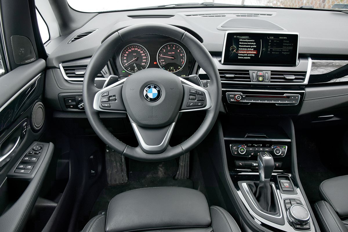 We wnętrzu modelu 2 Active Tourer czujemy się tak jak w każdym innym samochodzie bawarskiej marki. Typowa dla BMW aranżacja kabiny, z konsolą środkową wychyloną w kierunku kierowcy, znakomita ergonomia i jakość materiałów to od lat wizytówka niemieckiego producenta. Docenimy również przestrzeń w kabinie, tak w pierwszym, jak i w drugim rzędzie, oraz bardzo wygodne fotele. Model Active Tourer jest zatem pierwszym kompaktowym BMW, które w większym stopniu dopieszcza również pasażerów, a nie tylko kierowcę. Zgrzytem w nowym modelu jest tworzywo, jakim pokryto trójramienną kierownicę, które ma bardzo ostre kanty. Gdy spróbujemy obrócić kierownicę, trzymając nie za wieniec, a za ramię, to istnieje duża szansa, że się zadrapiemy lub skaleczymy.