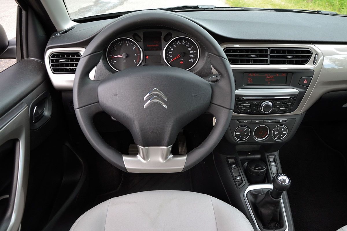 Najwięcej zastrzeżeń wzbudza wnętrze Citroëna – pełne przesadnych uproszczeń oraz ciemnoszarych, tanich i twardych tworzyw niskiej jakości. Mamy wrażenie, że producent celowo starał się uczynić kabinę mniej funkcjonalną. Na środkowej konsoli i między fotelami brakuje schowków i uchwytów, w tylnych drzwiach nie pomyślano o kieszonkach na drobiazgi. Do zaakceptowania są przyciski opuszczania szyb bocznych umieszczone na środkowej konsoli, jednak umieszczenie przycisków opuszczania szyb w drugim rzędzie drzwi między oparciami foteli już nie. Kierownicę możemy regulować tylko w pionie, ale w bardzo niewielkim zakresie. Do tego proste radio jest mało ergonomiczne. Duże pokrętło na jego środku nie służy do regulacji głośności, jak intuicyjnie założy każdy kierowca, a do regulacji zakresu fal. Głośność ustawimy jedynie miniaturowymi przyciskami na radiu, co wymaga wprawy i odrywa wzrok kierowcy od jezdni. Ustawianie radia przyciskami pod kierownicą oraz bluetooth to przywilej topowej wersji. Plusem Citroëna okazują się miękkie, ale dość wygodne fotele.