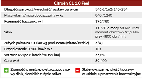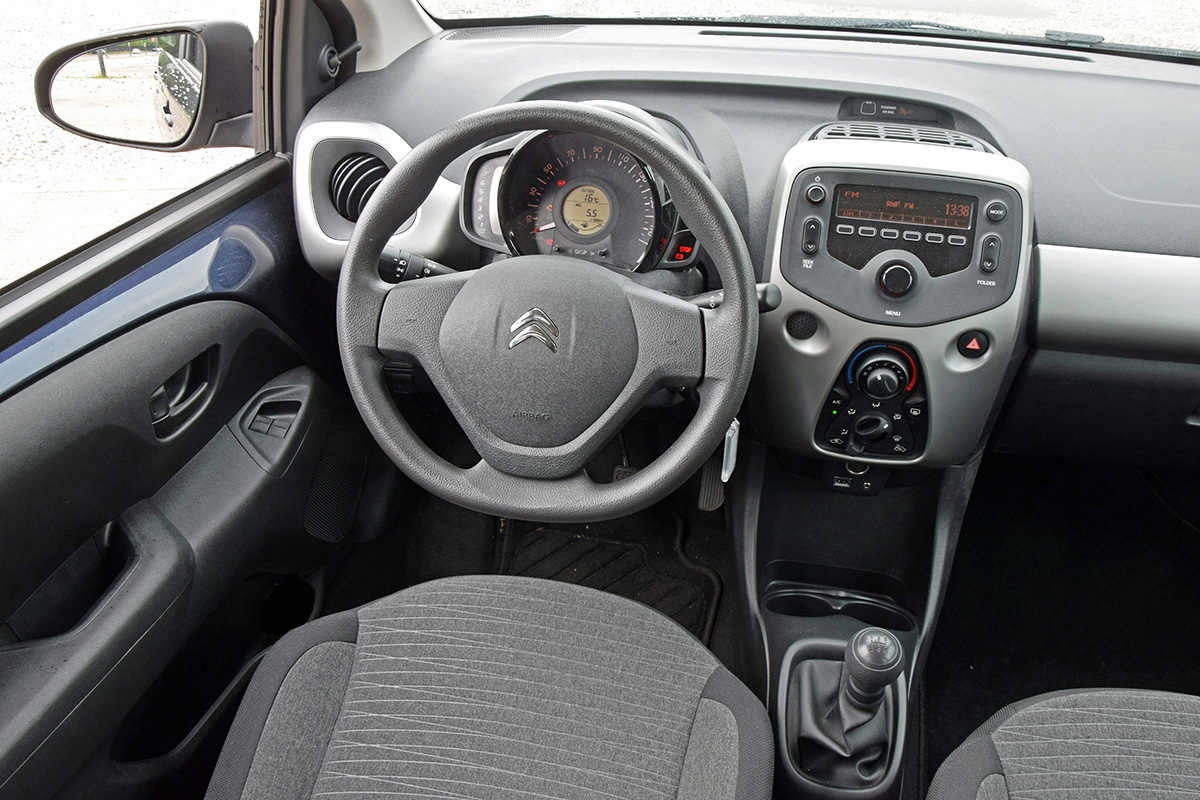 Nie należy też oczekiwać wyjątkowej przytulności we wnętrzu. Zewsząd otaczają nas tanie, niezbyt miłe w dotyku, szarobure i twarde tworzywa. Model C1 pełen jest uproszczeń konstrukcyjnych, które momentami wychodzą mu nawet na dobre. Blachy drzwi nie są w pełni zakryte od środka tworzywami. Dzięki temu, jeśli wybierzemy jaskrawy kolor nadwozia, to również wnętrze stanie się weselsze i przyjemniejsze dla oka. Wiele innych uproszczeń też nie jest szczególnie uciążliwe, np. zintegrowanie oparć foteli z zagłówkami, zamontowanie jedynie uchylnych okien w drugim rzędzie drzwi czy tylna klapa zbudowana z tafli przyciemnianego szkła, na którym zamontowano wycieraczkę, zamek i uchwyt do jej podnoszenia. Unosi się ona do góry z użyciem dwóch teleskopów, a nie jednego jak w starszym modelu. Podobnie nie przeszkadza nam obecność tylko jednej wycieraczki przedniej szyby. Za to przydałyby się dodatkowe uchwyty w podsufitce przy oknach. W kabinie nie brakuje schowków i wnęk na drobne przedmioty. Podobnie jak w starszym modelu zestaw zegarów, z dominującym prędkościomierzem, zamontowano na kolumnie kierownicy. W podstawowej wersji wyposażenia obrotomierz jest niedostępny, w średniej wymaga dopłaty (200 zł), a standardem jest dopiero w topowej wersji Shine.
