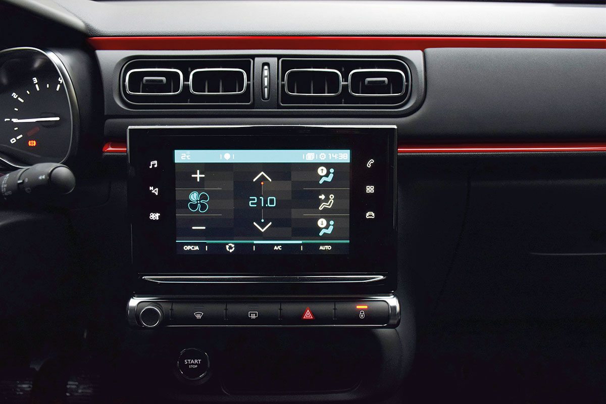 W centralnej części deski rozdzielczej dominuje ekran LCD o przekątnej 7 cali (standard w wersji Shine), z pomocą którego możemy obsługiwać m.in. klimatyzację, radio i nawigację. Dzięki temu rozwiązaniu ograniczono liczbę przycisków na środkowej konsoli do minimum, co nadało desce rozdzielczej minimalistycznego charakteru. Każda zmiana ustawień radia, klimatyzacji, nawigacji czy nawet zamykania obiegu powietrza, wymaga przełączenia widoków na ekranie i następnie naciśnięcia odpowiednich przycisków. Odrywamy przez to wzrok od jezdni i skupiamy się na panelu centralnym na zdecydowanie dłuższy czas, niż miałoby to miejsce w przypadku pokręteł, do których sięgamy intuicyjnie. Do tego w ostrym słońcu ekran staje się mniej czytelny, utrudniając wybranie kolejnych funkcji. Ta uwaga dotyczy niestety wszystkich nowych konstrukcji PSA, wykorzystujących tablety na środkowej konsoli.