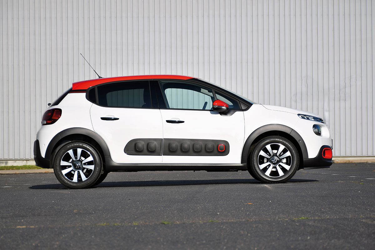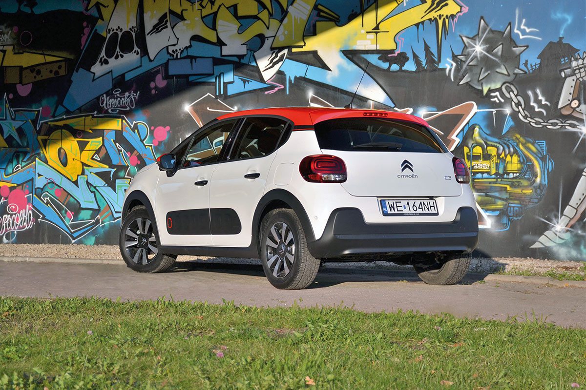 Twórcy nowej generacji C3 wyraźnie inspirowali się wyglądem większego Cactusa. Efekt można uznać za udany ‒ mieszczuch Citroëna wygląda efektownie i świeżo, a w opinii pań nawet uroczo. Nowa generacja jest dłuższa od poprzednika (399,6 cm/+5,5 cm) oraz ma wyraźnie większy rozstaw osi (254 cm/+8 cm). Do tego jest aż o 5 cm niższa niż starsza generacja (147,4 cm) i minimalnie szersza, dzięki czemu sylwetka wygląda bardziej dynamicznie. Producent postawił na duże możliwości personalizacji modelu C3. Nabywcy topowej wersji Shine (jak w testowanym egzemplarzu) mogą wybrać jeden z czterech kolorów dachu. Dach ten jest oddzielony od reszty nadwozia lakierowanymi na czarno słupkami A i B. Kontrastowe kolory nadwozia i dachu elegancko łączą się na słupku C. W tym samym kolorze co dach lakierowane są lusterka i obudowy świateł przeciwmgielnych. Wraz z dziewięcioma kolorami nadwozia daje to 36 możliwych konfiguracji. A do tego dochodzi mnogość wzorów felg do wyboru.
