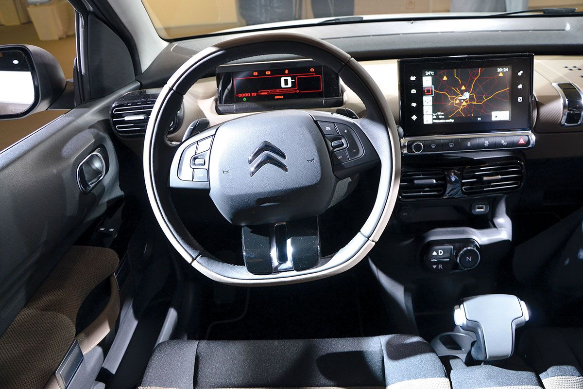 Wiele nowinek dostrzeżemy też we wnętrzu. Już klamka służąca zamykaniu drzwi przypomina rączkę eleganckiej damskiej torebki. Standardem jest 7-calowy ekran dotykowy na środkowej konsoli oraz cyfrowy zestaw zegarów za kołem kierownicy. Poprzez ekran dotykowy mamy możliwość sterowania m.in. klimatyzacją, multimediami, nawigacją czy ustawieniami telefonu. W wersjach ze sterowaną elektronicznie skrzynią biegów ETG zastąpiono tradycyjną dźwignię zmiany biegów uproszczonym systemem Easy Push, który obejmuje konsolę z przyciskami D, N, R w dolnej części deski rozdzielczej i manetkę przy kierownicy do ręcznej zmiany przełożeń. Ciekawym rozwiązaniem jest podłokietnik między fotelami z przodu, który po podniesieniu do pionu stworzy nam jednolitą kanapę. Nie mniej intrygująco rozwiązano problem, gdzie umieścić poduszkę powietrzną przed pasażerem. Spory schowek uniemożliwia sensowne umieszczenie airbagu. Citroën zdecydował się umieścić poduszkę powietrzną... w podsufitce dachu. W wersji z panoramicznym dachem zamontowano szybę o wysokim stopniu izolacji termicznej. Tym samym producent mógł zrezygnować z rolety i odchudzić pojazd o 25 kg. O kolejne 11 kg niższą masę uzyskano rezygnując z montażu mechanizmów podnoszenia okien w drugim rzędzie drzwi. W to miejsce zastosowano szyby uchylne jak w modelu C1. Cactus dysponuje bagażnikiem o pojemności 358 litrów, który można powiększyć przez złożenie oparcia tylnej kanapy. Niestety, nawet w bogatszych wersjach uzyskana powierzchnia nie jest płaska, a oparcie kanapy nie jest dzielone. To rażące uproszczenie producent uzasadnia chęcią obniżenia masy (tu uzyskał 6 kg). Nas to nie przekonuje.