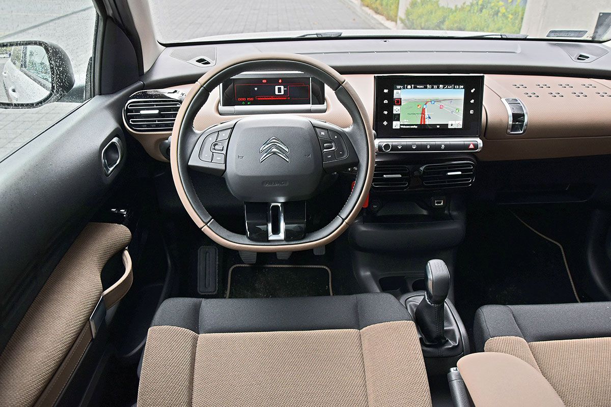 Wnętrze C4 Cactusa przy pierwszym spojrzeniu robi znakomite wrażenie. Jest ono przytulne, wykończone niezłej jakości tworzywami, które w górnej części deski rozdzielczej są przyjemnie miękkie. Oryginalnym i niezwykle efektownym rozwiązaniem jest standardowy montaż cyfrowego zestawu zegarów za kołem kierownicy i 7-calowego ekranu dotykowego na środkowej konsoli. Użytkownicy zafascynowani smarfonami i tabletami będą zachwyceni, szczególnie, że producent zapewnia możliwość skopiowania interfejsu i aplikacji z telefonu na ekran pojazdu. Poprzez ekran dotykowy mamy też możliwość sterowania m.in. klimatyzacją, multimediami czy nawigacją. Zabrakło za to przycisku do szybkiego włączania zamkniętego obiegu powietrza w momencie, gdy przed nami na drodze pojawi się pojazd ziejący kłębami palonego oleju. Jeśli dotykowy ekran nie jest ustawiony na obsługę systemu klimatyzacji, to zamknięcie obiegu powietrza i poszukiwanie odpowiedniego przycisku trwa stanowczo zbyt długo i wymaga dość długiego odrywania wzroku od jezdni. Poza tym na wyświetlaczu przed kierowcą nie znajdziemy obrotomierza, choć nie zabrakło wskaźnika optymalnego przełożenia biegów.