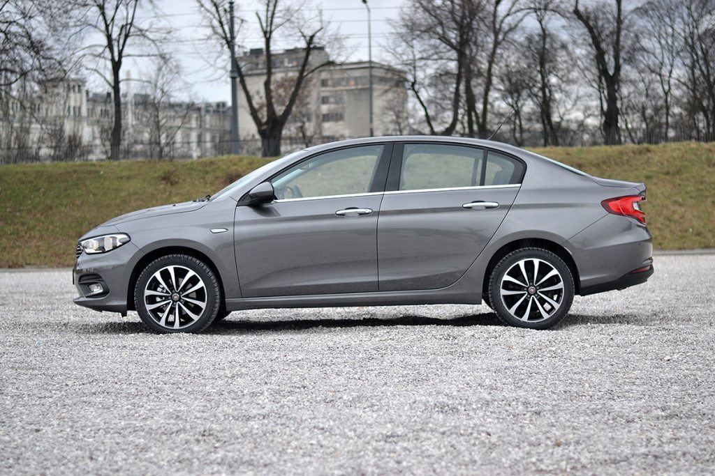 Pełne miękkich linii i wyobleń nadwozie sedana Fiata prezentuje się nowocześnie i elegancko, nie zdradzając wyglądem, że jest w istocie niedrogim i prostym samochodem. Nowe Tipo możemy już nazwać pełnoprawnym modelem segmentu C, w odróżnieniu od Linei zaliczanej do segmentu B+. Samochód powstał na zmodyfikowanej platformie wykorzystywanej już np. w modelach 500X, 500L oraz Jeepie Renegade. Co prawda nowość Fiata jest o 3 cm krótsza od Linei (453 cm), ale aż 6 cm szersza (179 cm), czyli ma dokładnie taką samą szerokość jak Volkswagen Golf. Rozstaw osi również jest przyzwoity – 263,6 cm, czyli 3 cm więcej niż w Linei i tyleż więcej co w Fiacie Bravo.