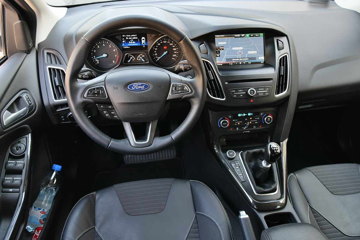 Jadę. Fotel nawet dla tak rosłej osoby okazał się wygodny, choć minimalnie dłuższe mogłoby być siedzisko. Od razu bardzo do gustu przypadła mi kierownica. Nie dość że nieduża, to bardzo przyjemna w dotyku i dobrze wyprofilowana. Czasami takie drobiazgi czynią podróż przyjemniejszą. Trochę irytujące było to, że światła dzienne nie przełączyły sie automatycznie w światła mijania, ale w innej opcji jest to możliwe. Nie do końca jestem również przekonany do tak głośnego dźwięku włączonego kierunkowskazu. Bardzo podobał mi się za to wyświetlacz komputera, na którym w jednym okienku były dane dotyczące zużycia paliwa, liczby przejechanych kilometrów, zasięgu i chwilowego zużycia paliwa. Niestety, tak jak napisałem wcześniej, nie miałem do tej pory okazji jeździć Focusem, dlatego poprosiłem o pomoc kolegę, który służbowo i prywatnie porusza się tym modelem. Kiedy zajął miejsce za kierownicą, powiedział: wow. Stwierdził, że właściwie wszystko jest nowe. Zwrócił też uwagę na kierownicę, nowy panel klimatyzacji, mówił o innym układzie komputera pokładowego. Najdłużej zatrzymaliśmy się na systemie SYNC. Dla mnie sam system jest ok., chociaż nie do końca rozumiem, dlaczego panel główny jest tak zaprojektowany, że jego prawa strona, ta od pasażera, jest grubsza, co nie do końca ma sens. Pasażer ma odrobinę utrudnione sterowanie.