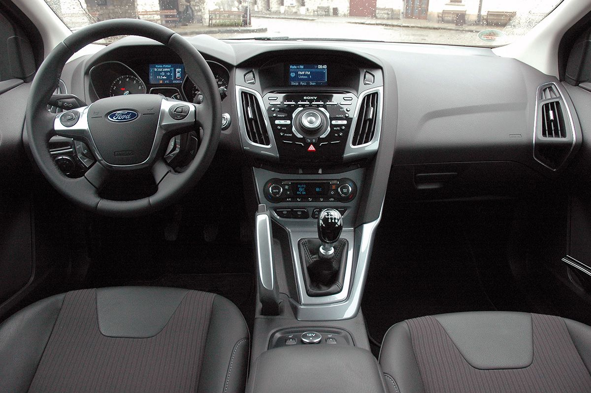 I mam tu na myśli naprawdę standard. Bo o tym, co w Focusie może być, a czego w niektórych autach klasy premium próżno szukać, będzie za chwilę. Teraz o tym, co w każdym Focusie jest. Więc przede wszystkim to, co widać. Koncepcja stylistyczna, znana z innych modeli Forda, kinetic design, czyli – jak to ładnie ujął kiedyś mój naczelny – „stoisz, a jedziesz”, w nowym Focusie jest jak najbardziej widoczna. Podobno poprzednia wersja tego auta była stylistycznie nudna. Ta na pewno nie jest. Focus wygląda fajnie i niecodziennie. Zresztą, oceńcie sami. Mnie się podoba, komuś może się nie podobać, na pewno nie jest nijaki. Teraz zaglądamy do środka i zaczyna się. Trochę jak z auta nie tej klasy. Bardzo dobre materiały, ładnie wykończone, świetnie spasowane. Gusta gustami, ale nie wiem, czy jest ktoś, kto powie, że nowy Focus jest w środku brzydki. A jakość to już osobny temat. Jako ciekawostkę powiem, że wewnętrzna klamka drzwi nie jest z lakierowanego na srebrno plastiku. Jest metalowa. Co jeszcze zwróci naszą uwagę we wnętrzu? Cisza. Nowy Focus jest wyśmienicie wytłumiony. Nie przesadzę mówiąc, że trzeba patrzeć na obrotomierz. Bo jeśli sie zamyślimy, to o tym, że dokręciliśmy silnik do końca, dowiemy się,gdy auto przestanie jechać. Nie jest tak, że silnika w ogóle nie słychać, ale nawet przy najmocniejszej wersji i siedmiu tysiącach obrotów wewnątrz nadal jest komfortowo cicho. To samo przy jeździe z wysokimi prędkościami. Nic nie szumi, nie gwiżdże. 160 km/h na liczniku, a powietrze bezgłośnie opływa samochód. Można się zdziwić. Zresztą, komfort jazdy nowym Focusem to nie tylko cisza, to również naprawdę wysoki komfort prowadzenia, który zawdzięczamy głównie świetnemu zawieszeniu. Ford nie eksperymentuje z belkami skrętnymi i temu podobnymi, mającymi dodać trochę miejsca czy odjąć parę kilo. Dlatego z tyłu zostało bardzo dobre wielowahaczowe zawieszenie. I to się czuje przy jeździe po nierównościach czy w ciasnych zakrętach. Auto naprawdę bardzo fajnie trzyma się drogi, bardzo dobrze też znosi jej nie najlepszą nawierzchnię. Nie ma tendencji ani do uciekania przodem, ani tyłem. Jest neutralnie wyważone i – jeszcze raz to powiem – bardzo przyjemnie się je prowadzi.