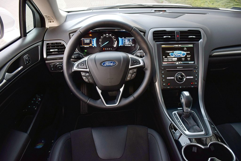 Wnętrze hybrydowego Mondeo jest przestronne, zwłaszcza z przodu. Fotele okazują się bardzo wygodne i dobrze trzymają w zakrętach. Dla wymagających przygotowano fotele z regulacją w 10 kierunkach. Na pochwałę zasługuje jakość montażu i użyte w kabinie materiały. Tak jak w innych wariantach Mondeo, na środku deski rozdzielczej znajduje się okazały 8-calowy ekran dotykowy. Niestety, nie jest on mistrzem intuicyjności. Ustawianie nawigacji jest żmudne, a czułość ekranu pozostawia wiele do życzenia.