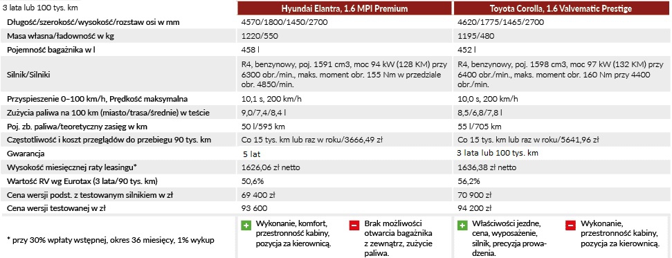Podstawowa wersja Corolli (wersja Active), z porównywalnym co w Elantrze silnikiem benzynowym o pojemności 1,6 l jest droższa o 2,5 tys. zł. Oba modele mają też podobne wyposażenie. Jednak im droższą wersję Corolli wybieramy, tym więcej zyskujemy. Topowa odmiana Toyoty (Prestige) kosztuje 89,4 tys. zł, natomiast topowa odmiana Hyundaia 91,4 tys. zł. Różnice niby niewielkie, ale pod względem wyposażenia górą jest Corolla. Ma też o 1490 zł tańszy system nawigacji satelitarnej (2500 kontra 3990 zł). Na korzyść japońskiego sedana należy też zapisać wyższą wartość rezydualną. Za to w kwestii gwarancji górą są Koreańczycy – Elantra ma nie trzy a pięć lat ochrony producenta, w dodatku nie jest ona limitowana przebiegiem.
