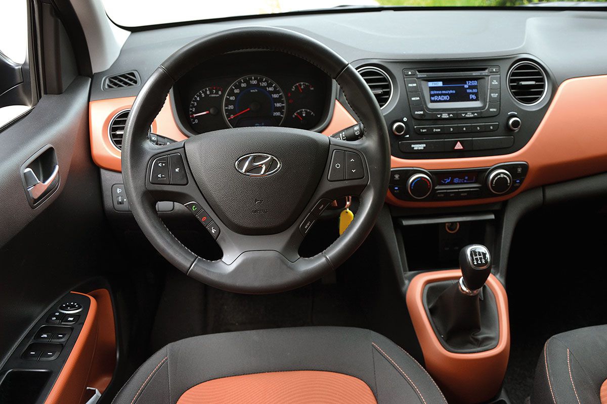 Samochód prezentuje wyraźnie wyższy poziom w zakresie wyposażenia i ergonomii w porównaniu np. z trojaczkami Škody, Seata i VW. W odróżnieniu od tych modeli w koreańczyku z Turcji mamy normalne regulowane zagłówki w przednich fotelach (u rywali są zespolone z oparciem), na drzwiach nie straszy goła blacha, w drugim rzędzie drzwi możemy opuszczać okna (rywale oferują okna uchylane), na kierownicy w wyższych wersjach znajdziemy wiele przydatnych przycisków, np. do obsługi telefonu czy komputera pokładowego (u rywali nie ma ich nawet w opcji). Hyundai nie zapomniał także o regulacji wysokości pasów bezpieczeństwa w środkowych słupkach, które to rozwiązanie nie jest częste nawet w autach kompaktowych. Co więcej, w modelu i10 mamy możliwości opuszczania prawej szyby przyciskiem w drzwiach kierowcy, a także opuszczania szyb tylnych (w wersji Premium). Rywale również tego nie oferują. To niby drobnostki, ale łącznie czynią one Hyundaia pojazdem dojrzalszym i nieodbiegającym funkcjonalnością od dobrych aut segmentu B. Do perfekcji jednak trochę brakuje. W modelu i10 koło kierownicy ma za dużą średnicę jak na miejskiego malucha, a kierownicę możemy regulować tylko w pionie, i to w niewielkim zakresie. Hyundaiem możemy przewozić ludzi i ładunki o wadze nawet 487 kg, choć jego masa własna to 933 kg. To nieco mniej niż w Fiacie Panda (500 kg), ale wyraźnie więcej niż w Volkswagenie Up! (436 kg).