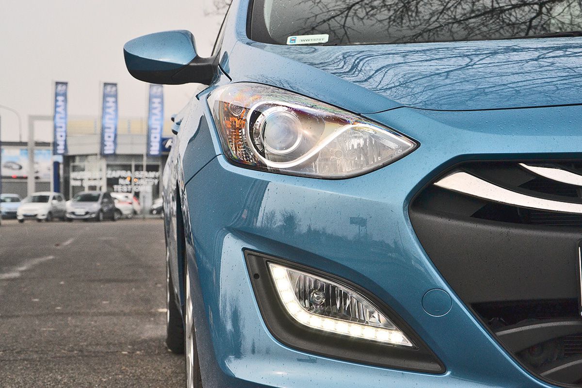 Nowy i30 jest dłuższy od poprzednika o 5,5 cm (430 cm), ale rozstaw osi pozostał bez zmian – 265 cm. Nadwozie za to jest niższe i minimalnie szersze. Hyundai udowodnia, że kompakty popularnych marek nie muszą wyglądać bezpłciowo. I30 jest najładniejszym współczesnym modelem tej marki daleko ciekawszym stylistycznie od stonowanego poprzednika. Ale to oczywiście sprawa subiektywna. Dynamiczne linie, unoszące się w tyle nadwozia, sprawiają wrażenie, że pojazd jedzie stojąc, co było celowym zabiegiem projektantów. Producent pomyślał o montażu świateł do jazdy dziennej LED nawet w wersji podstawowej. Niestety klamki drzwi i lusterka w kolorze nadwozia oraz kierunko-