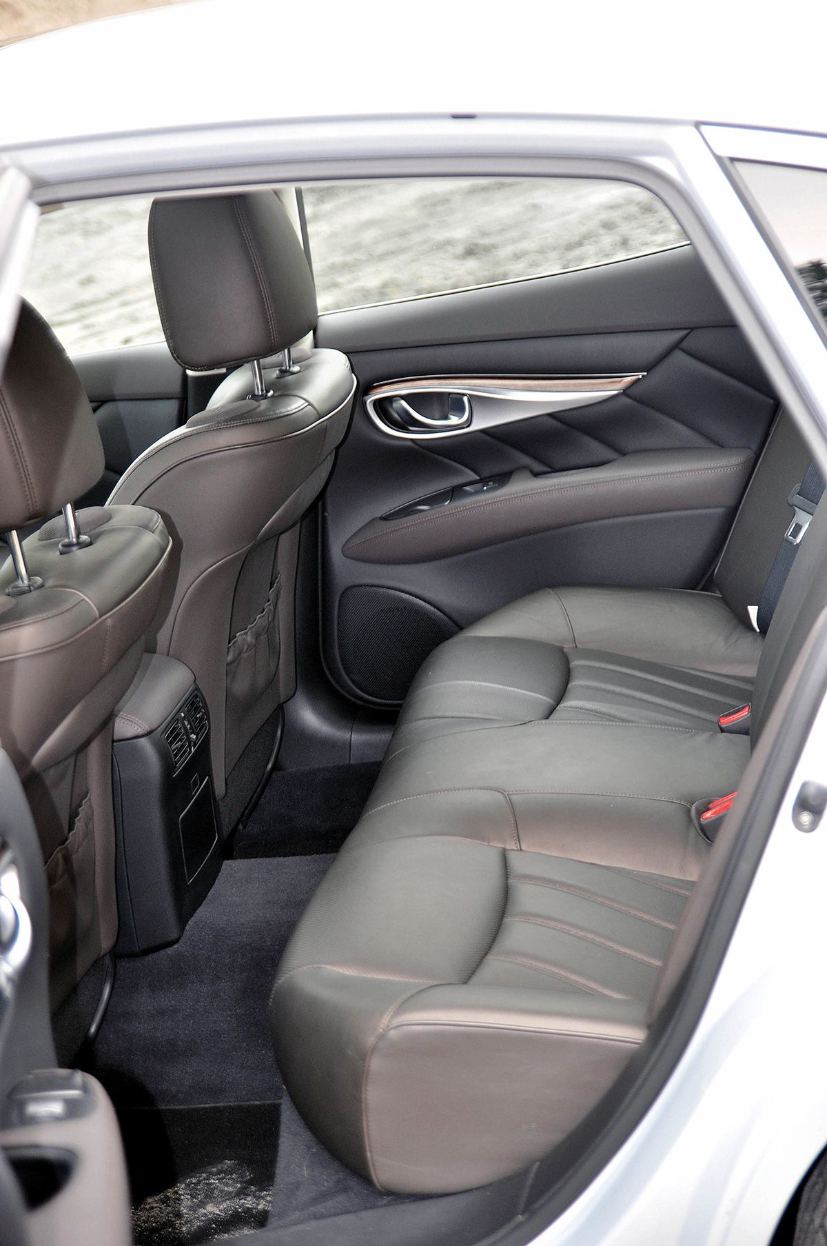 Jak wspominałem wcześniej, wsiadając do tego samochodu, czujemy się tak, jak powinniśmy się czuć wsiadając do auta tej klasy. Otacza nas pięknie wykończona drewnem deska rozdzielcza, która w żadnym wypadku nie zalatuje kiczem(jak w niektórych autach niższych klas wyposażonych w drewniane elementy wykończenia). Cały kokpit pokryty jest skórą, taką samą jak na fotelach, sprawia to wrażenie dużej przytulności i miękkości. Fotele świetnie dopasowujące się do ciała, regulowane w kilku płaszczyznach w aucie tej klasy to już absolutny standard. Na uznanie zasługuje także ogrzewana kierownica, jej rozmiar jest idealny, a trzymanie w rękach wzorowe, drobne zastrzeżenie można mieć jedynie do liczby przycisków na niej obecnych, ale nie ma obowiązku ich używania. Infiniti przyłożyło dużą wagę do szczegółów, świetnie wykończony jest nie tylko kokpit, ale także boczki, podłokietnik i tak naprawdę wszystko, co znajduje się kabinie pasażerskiej.