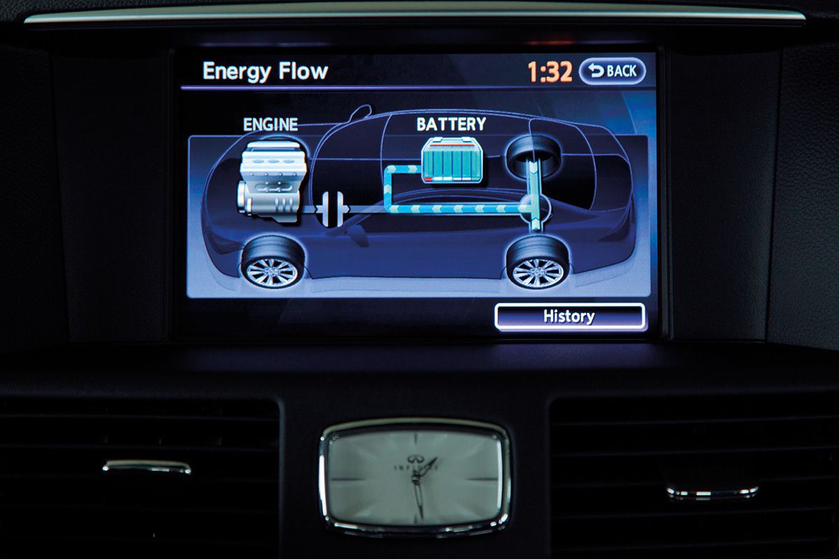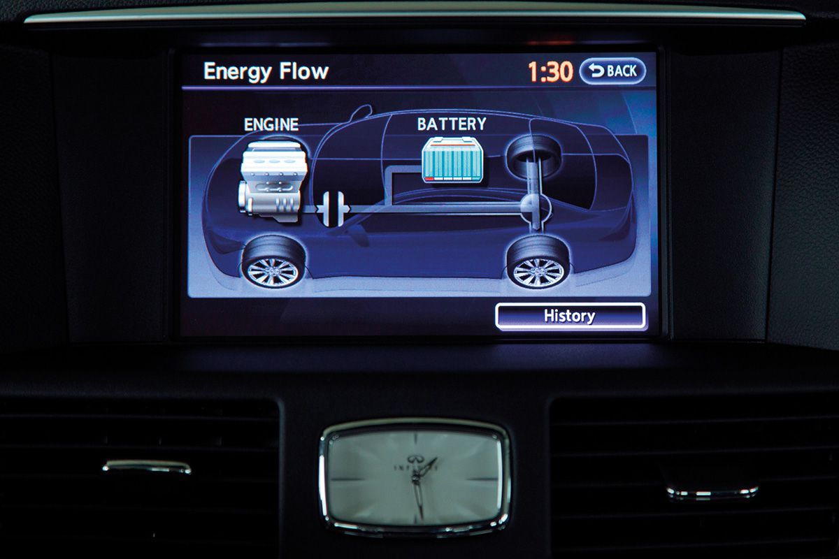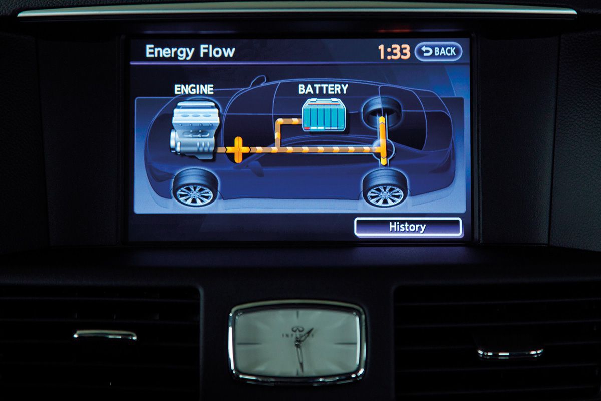 Na centralnym miejscu w kabinie znajduje się duży dotykowy wyświetlacz – centrum dowodzenia auta. Tu ustawimy nawigację, wybierzemy ulubioną muzykę albo uruchomimy komputer pokładowy, który ma też kilka ciekawych opcji. W jednej z opcji menu możemy efektownie śledzić przepływ energii w samochodzie, ciekawy gadżet, który w trakcie normalnej jazdy nie jest raczej zbyt przydatny, ale z drugiej strony – zachwyci pasażerów. Czyż nie o to po części chodzi w tym aucie? Komputer pozwala także na śledzenie historii cyklów ładowania i rozładowania baterii, historii ekonomii spalania paliwa, aktualnego ciśnienia w oponach czy aktualnego spalania. Jest tam wszystko, co może być potrzebne w trakcie jazdy. Równie ciekawą opcją jest możliwość komunikacji z samochodem za pomocą głosu, ale system wymaga jeszcze dopracowania. Za jego pomocą możemy wykonać telefon, obsługiwać nawigację albo radio. Jednak dużo wody upłynie w Wiśle, zanim system Infiniti będzie tak pomocny jak Kid z „Nieustraszonego”. Wydawanie poleceń jest bardzo ograniczone i wymaga dużej dokładności, a co za tym idzie – obsługa zajmuje sporo czasu. Dodatkowo system nie działa w wersji polskojęzycznej.