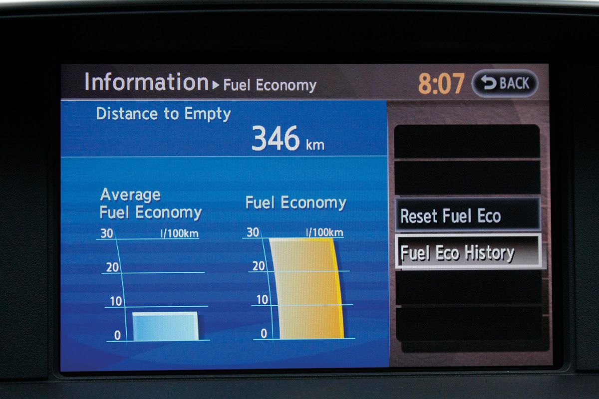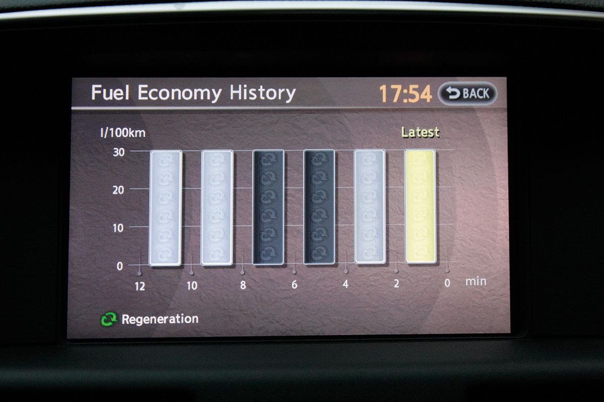 Ten hybrydowy samochód jest także oszczędny, a przy okazji ekologiczny, w końcu po to został stworzony. W trakcie miejskiej jazdy w korkach dużą cześć pokonujemy tylko na prądzie. Silnik benzynowy podczas postoju i wolnego posuwania się w korkach nie pracuje wcale. Akumulatory pozwalające na jazdę na prądzie ładowane są głównie z energii odzyskiwanej w trakcie hamowania albo w trakcie pracy na wolnych obrotach silnika benzynowego. Na centralnym ekranie możemy wyświetlić informację, w jaki sposób i gdzie przepływa energia w całym samochodzie. Kiedy poruszamy się spokojnie w cyklu pozamiejskim, silnik benzynowy wyłącza się podczas hamowania. Przy pierwszym spotkaniu z M35h może to powodować małą panikę – silnik gasnący przy 120 km/h nie wróży nic dobrego – ale spokojnie, to ma tak działać. Silnik wyłącza się także, gdy baterie pozwalają na jazdę na silniku elektrycznym. Przy jednostajnej prędkości, bez gwałtownego przyspieszania, samochód może jechać z prędkością nawet 120 km/h. Wszystko to ma sens. Dlaczego? Bo podczas naszego testu ponad 30% czasu auto podróżowało w trybie elektrycznym (wiemy to na pewno, bo w aucie są odpowiednie wskaźniki). Ogromna pięciometrowa limuzyna w trakcie normalnej jazdy w trasie spala około 6,5 l/100 km. Wynik wprost rewelacyjny jak na auto tej klasy bez charakterystycznego klekotu pod maską, który nie zapewniłby nawet w połowie tak niesamowitych osiągów.