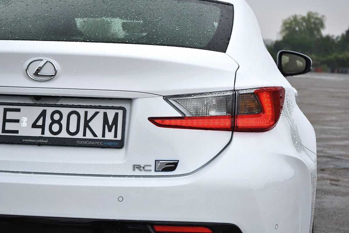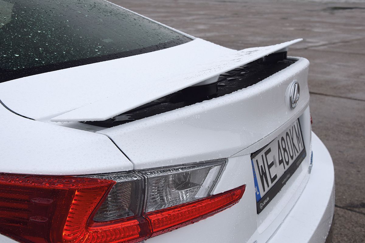 Model RC-F wyposażono w automatycznie wysuwany przy prędkości 80 km/h spojler, który możemy podnieść również ręcznie, po naciśnięciu przycisku pod kierownicą po lewej stronie. Trzeba to robić umiejętnie. Bawienie się publicznie w podnoszenie i opuszczanie tylnego spojlera w Lexusie RC-F jest równie stosowne jak spożywanie banana, patrząc drugiemu mężczyźnie w oczy.