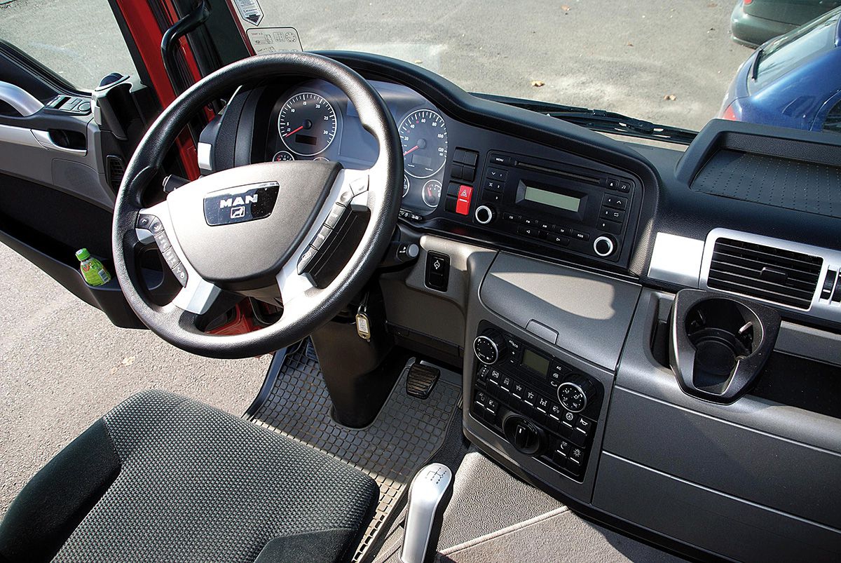 Komfortowe wnętrze zmodernizowanej kabiny, nowoczesny silnik i niskie zużycie paliwa to jednak podstawowe atrybuty tej ciężarówki. Kierowca zajmuje miejsce w dobrze wyciszonej kabinie z pojedynczym łóżkiem, na wygodnym fotelu z podłokietnikami i pneumatycznym układem tłumienia nierówności. Do tego kieruje za pomocą wielofunkcyjnej kierownicy, regulowanej w dwóch zakresach położenia. Dlatego poczucie prowadzenia pojazdu o wiele mniejszego, niż jest w rzeczywistości, towarzyszy kierującemu przez cały czas jazdy. Praca kierowcy w tej serii niemieckich ciężarówek jest łatwa i przewidywalna również dzięki ergonomicznemu rozplanowaniu instrumentów pokładowych. Informacje na temat funkcjonowania podzespołów pojazdu przedstawiane są na wielofunkcyjnym wyświetlaczu i dużych, przejrzystych zegarach z obręczami. Obsługa menu nie wymaga dłuższej chwili zastanowienia, gdyż kolejne kroki jego przeglądania są intuicyjnie rozplanowane. Lusterka o dużej powierzchni wyposażono w nowy system odprowadzania wody. Pozwala on na zmniejszenie zabrudzenia nie tylko samych luster, ale dodatkowo szyb bocznych. Jak podaje producent to dzięki nowej konstrukcji lusterek kabiny, szumy spowodowane wiatrem zostały zmniejszone o 30 procent.