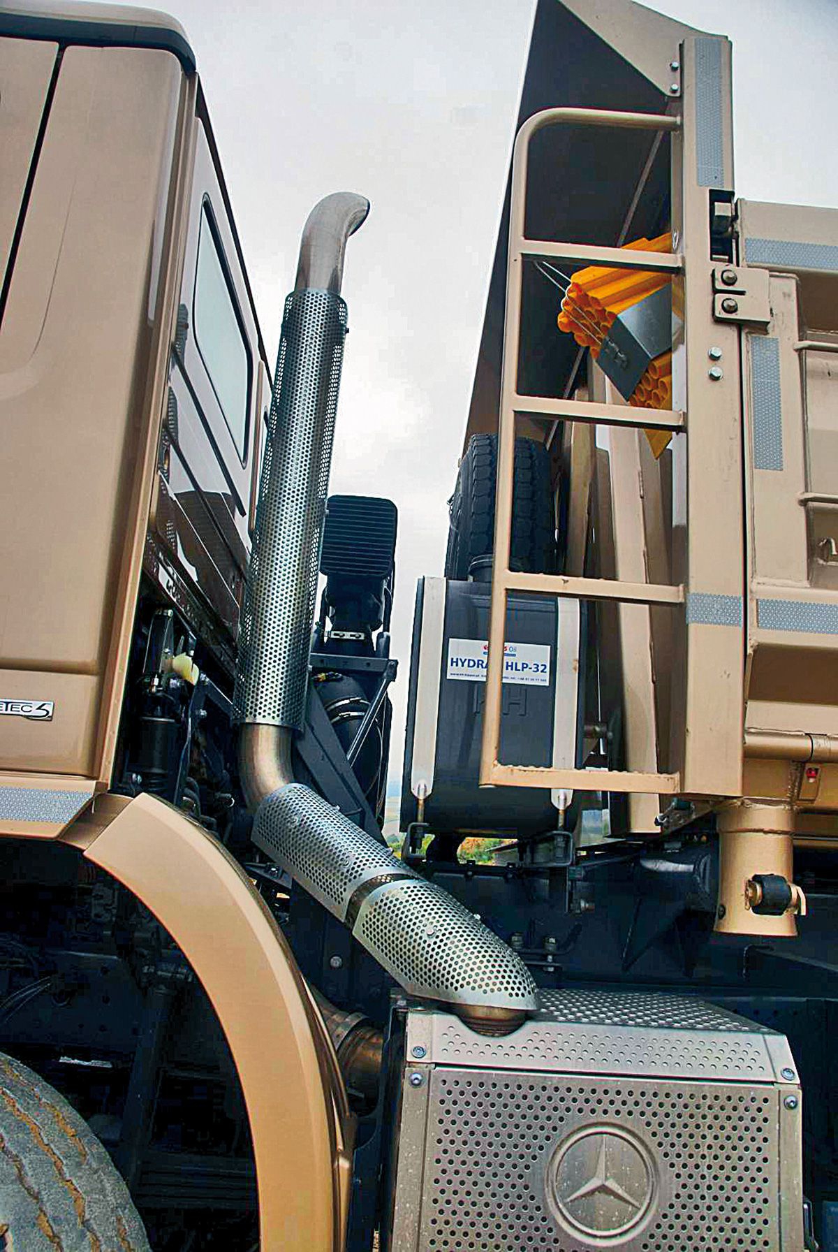 Na uwagę zasługuje również zainstalowana na prezentowanym Actrosie zabudowa – wywrotka rodzimej produkcji, bo firmy KH Kipper z Kielc. Jej przemyślana konstrukcja umożliwia dwustronny wyładunek. Dodatkowa, boczna burta wyładowcza otwierana jest hydraulicznie za pomocą oddzielnej dźwigni w kabinie. Rozwiązanie to sprawdza się na przykład przy bocznym zasypywaniu wykopów przy drogach i wszędzie tam, gdzie występuje ograniczona możliwość manewrowania ciężarówką. Dodatkową zaletą jest to, że otwierana w dół burta zapobiega podsypywaniu ładunku pod koła.