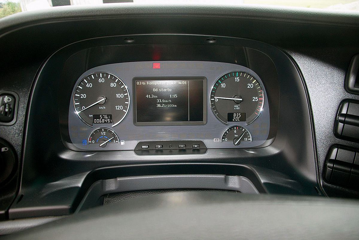 Do kabiny Actrosa prowadzą wysoko umiejscowione stopnie, jej wysokość uzasadnia terenowy prześwit, obecność przedniego mostu napędowego i solidnego zawieszenia piórowego. Wewnątrz jest tradycyjnie dla marki utrzymany kokpit, którego funkcjonalność, rozplanowanie, nawet jakość materiałów są godne najwyższych not. Jeśli wnętrze kabiny chcielibyśmy uznać za dobrze wyciszone, trzeba poruszać się z wyższymi prędkościami, bo wolnej jeździe towarzyszy – podobnie jak w przypadku każdej innej ciężarówki – specyficzne głośne tarabanienie silnika. Nawet jeśli kierowca spędzi za kierownicą Actrosa więcej czasu, to i tak czasem pomruczy z niezadowolenia na nowe lusterka, poza którymi… świata nie widać. Niestety, w projektowaniu bądź co bądź efektownej obudowy ich szkieł zapomniano o zmniejszeniu przez to ich kubatury. W efekcie widziany z kabiny boczny profil zespolonych lusterek zajmuje dodatkowe pole widzenia kierowcy przez boczne okna, co stanowi niebezpieczeństwo dla niewidocznych wtedy dla niego przechodniów.