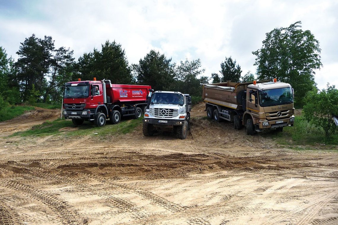Drugą „terenówką”, cieszącą się dużym powodzeniem i podziwianą przez wszystkich, był Unimog, podobnie jak w przypadku Zetrosa, za sprawą swoich zdolności terenowych. Unimog jest mniejszy, co pozwala dotrzeć w niedostępne dla większych modeli miejsca. Poprawia to też znacznie możliwości manewrowe na budowach, podczas prac terenowych, a czasem także w ciasnych, miejskich uliczkach. Wynika to z uniwersalnego zastosowania Unimoga. Możliwości zabudowy są tak szerokie, że poza branżą budowlano-remontową wykorzystuje się go np. przy pracach energetycznych, ogrodniczych, rolniczych i każdych innych, gdzie ten sprawny pojazd jest w stanie wjechać. A dotrzeć może prawie wszędzie, wynika z prób przeprowadzanych w Kajkowie. To zasługa m.in. specjalnej ramy, podatnej na skręcanie, i zawieszenia składającego się ze sprężyn śrubowych i amortyzatorów teleskopowych ze stabilizatorami na obu osiach. W ofercie są silniki o mocach od 150 do 218 KM, z elektropneumatyczną skrzynią biegów Telligent z preselekcyjnym wyborem przełożeń i komputerem, sugerującym na wyświetlaczu optymalne przełożenie dla danej prędkości i obciążenia. A jest w czym wybierać, bo pojazd ma 8 biegów do jazdy naprzód i 6 wstecznych. Unimog jest napędzany na tylne koła i ma dołączany napęd na oś przednią. Montuje się też blokady mechanizmów różnicowych przedniej i tylnej osi, a dodatkowo nad bezpieczeństwem jazdy czuwa układ EQR, niwelujący poślizg kół. Pokonywanie stromych zjazdów ułatwia dwustopniowy hamulec silnikowy. Wrażenie po jazdach na poligonie są takie, że Unimog jest wręcz idealnym pojazdem do stosowania tam, gdzie nie mogą wjechać inne auta na kołach. Następnym stopniem są już chyba tylko gąsienice. Możliwości tego auta są naprawdę imponujące.