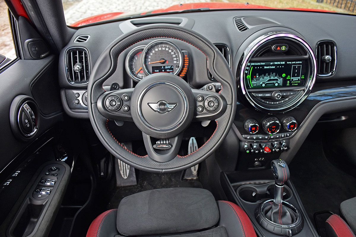 Nas jednak bardziej cieszy wyraźnie wyższa jakość materiałów wykończeniowych niż w poprzedniku, montaż w standardzie mięsistej i niezwykle poręcznej kierownicy John Cooper Works oraz szeroki zakres regulacji kierownicy i sportowych foteli (opcjonalne), dzięki czemu z łatwością znajdziemy wygodną pozycję. Wnętrze Countrymana ma więcej utylitarnych zalet. Szybko docenimy przestronność wnętrza z przodu i z tyłu, całkiem pojemne schowki, obecność nawiewów dla pasażerów drugiego rzędu etc. Znajdziemy też rozwiązania rodem z MINIvanów, np. dzieloną wraz z siedziskami kanapę, którą można przesuwać na długości 13 cm (+1323 zł). Kompaktowe MINI znalazło się w czołówce segmentu w zakresie wielkości bagażnika ‒ 450 litrów. Praktycznym i pomysłowym gadżetem okazuje się specjalny fartuch z siedziskiem, który możemy rozłożyć na krawędź bagażnika i zderzak (+529 zł). Możemy się na nim oprzeć lub usiąść i np. zmienić buty na joggingowe, nie brudząc sobie ubrania. Tego komfortu nie mamy jednak przy wsiadaniu i wysiadaniu ‒ boczne progi nie są osłonięte drzwiami.