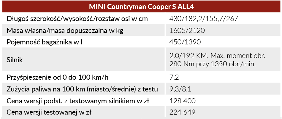 MINI Countryman powstał w oparciu o tę samą płytę podłogową co BMW serii 2 Active Tourer oraz X-jedynka, a więc pojazdy o bardziej rodzinnym charakterze. Nie mają się jednak czego obawiać kierowcy złaknieni większej dawki emocji. Countryman Cooper S jest nadal rasowym MINIakiem. Zestrojenie wielowahaczowego zawieszenia w zestawieniu z poprzednikiem jest bardziej komfortowe. Przejeżdżaniu krótkich, poprzecznych nierówności nie towarzyszy juz łomot i wstrząśnięcie pasażerami, jak miało to miejsce w poprzedniku. MINIak nie stracił przy tym swojego czupurnego charakteru, gdyż nadal prowadzi się niezwykle stabilnie w szybko pokonywanych zakrętach i podczas nagłych skrętów. W tym oczywiście zasługa również napędu na cztery koła umiejętnie rozdzielanego między osie przez elektronikę i sprzęgło wielopłytkowe. Świetnie z tym współgra bezpośredni i precyzyjny układ kierowniczy, czuły na każdy MINImalny ruch kierownicą ‒ to wizytówka i oczekiwana norma w każdym MINI.