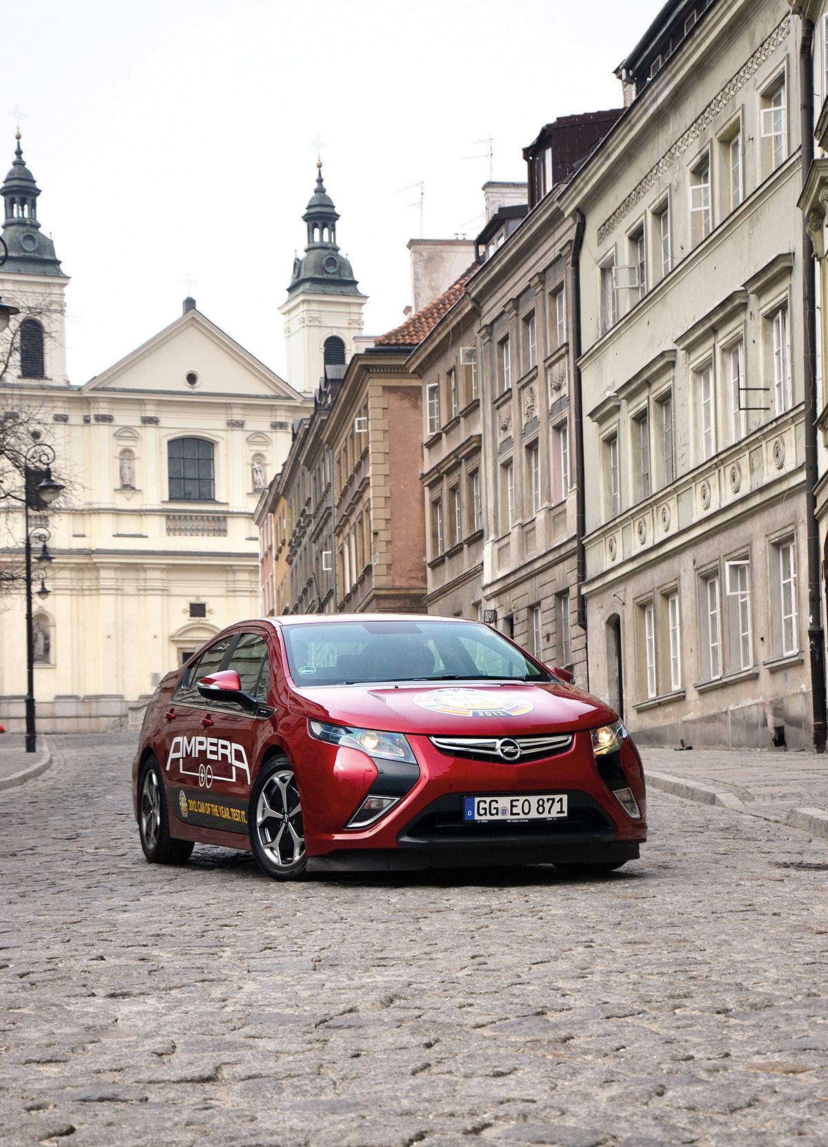 Ciekawostką jest funkcja podtrzymywania (Hold), dzięki której możemy wymusić korzystanie z napędu elektrycznego. Tym samym możemy wjechać do centrów miast, w których bez opłat mogą wjeżdżać wyłącznie auta elektryczne, np. Londynu. Na samych bateriach o pojemności 16 kWh możemy przejechać Amperą 40–80 km. Elektronika dba jednak o to, aby baterie były naładowane w zakresie 30–80%. Wówczas najbardziej przedłuża się ich żywotność. Według przedstawicieli Opla, to wartość zupełnie wystarczająca, ponieważ 80% kierowców poruszających się codziennie po mieście nie przejeżdża więcej niż 50 km. Samochód może być ładowany prądem o różnym natężeniu. Przy 16A ładowanie trwa 3–4 godz., jednak przy 6A już 9–10 godzin. Koszt jednego pełnego ładowania nie przekracza 6 zł. W cyklu miejskim, przy naprzemiennym wykorzystaniu energii elektrycznej pozyskanej z gniazdka i za pomocą silnika spalinowego, Ampera spala ok. 1,2 l benzyny na 100 km. Silnik spalinowy o pojemności 1,4 litra osiąga moc 86 KM i pracuje w najbardziej optymalnym dla siebie zakresie obrotów, i to niezależnie, kiedy i jak mocno naciskamy pedał gazu (pracuje on tylko jako prądnica). Jeśli samochód nie byłby ładowany z gniazdka elektrycznego, to w trybie rozszerzonego zasięgu przy intensywnym użytkowaniu w mieście lub na autostradach spalanie może wynieść ok. 6 l/100 km. Tym samym jego 35-litrowy bak starczy na przejechanie ok. 500 km. Motor ten jest nieźle wygłuszony. Do uszu pasażerów dochodzą jedynie jednostajne szmery silnika, który zazwyczaj jest zagłuszany przez szum powietrza, opon i radio.