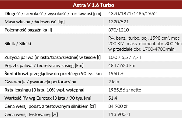 Samochód o takich osiągach, jakie oferuje Astra 1.6 Turbo, powinien sporo palić. I tu miłe zaskoczenie – podczas niespiesznej jazdy pozamiejskiej spalanie wyniosło 5,5 l/100 km. Na autostradzie, przy stałej prędkości 145 km/h Astra potrzebowała 7,6 l na przejechanie 100 km. W mieście i podczas dynamicznej jazdy spalanie wzrastało do 10 l/100 km. Nieźle.