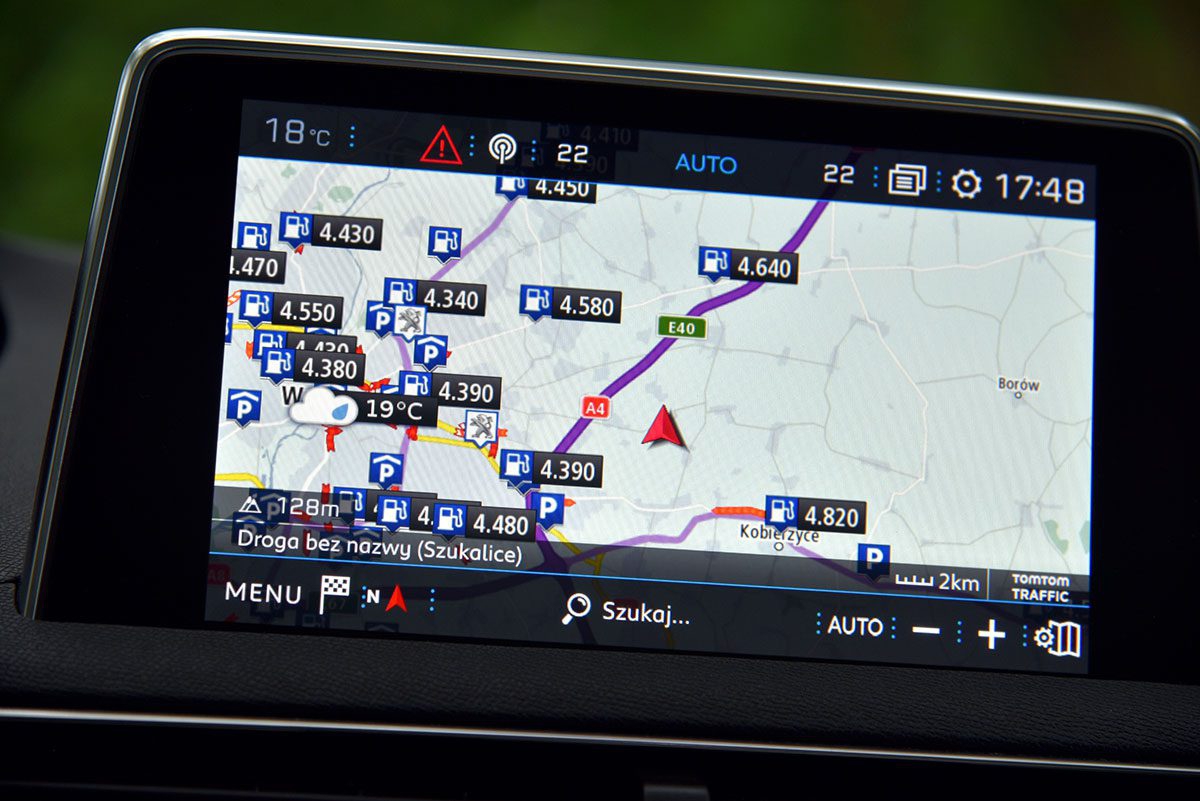 Na szczęście nad bezpieczeństwem kierowcy i pasażerów czuwa cały arsenał systemów wspomagających jazdę. Są tu: aktywny tempomat, automatycznie sterowane światła mijania i drogowe (w najdroższych wersjach są w pełni LED-owe), system odczytywania znaków drogowych, wyświetlacz head-up, układ monitorujący martwe pole oraz utrzymujący samochód na właściwym pasie ruchu. Peugeot upomina kierowcę, gdy ten jedzie zbyt blisko auta jadącego z przodu oraz gdy rozmowa telefoniczna trwa dłużej niż 10 minut. Tak bardzo o moje bezpieczeństwo nie troszczy się nawet żona. Nawigacja dzięki funkcji online na bieżąco informuje o natężeniu ruchu na drodze i jeśli to konieczne, podpowiada objazd z bardziej płynnym ruchem.