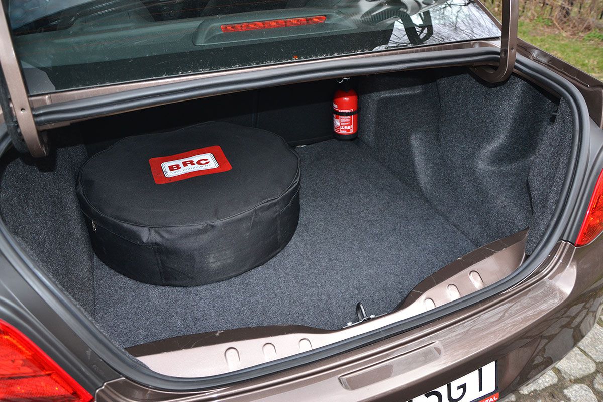 Otwór bagażnika nie jest zbyt duży, ale za nim kryje się potężna przestrzeń ładunkowa o kubaturze 508 litrów, którą można powiększyć składając oparcia kanapy do 1038 litrów. Niestety, nieco funkcjonalności odbiera mu konstrukcja potężnych zawiasów, które wnikają do środka i teoretycznie mogą uszkodzić bagaż podczas zamykania. W bagażniku pod podłogą, w miejscu koła zapasowego, zamontowano toroidalny, 35-litrowy zbiornik na LPG firmy Stako. Pełnowymiarowe koło zapakowano w torbę, którą możemy dowolnie umieścić w samochodzie.