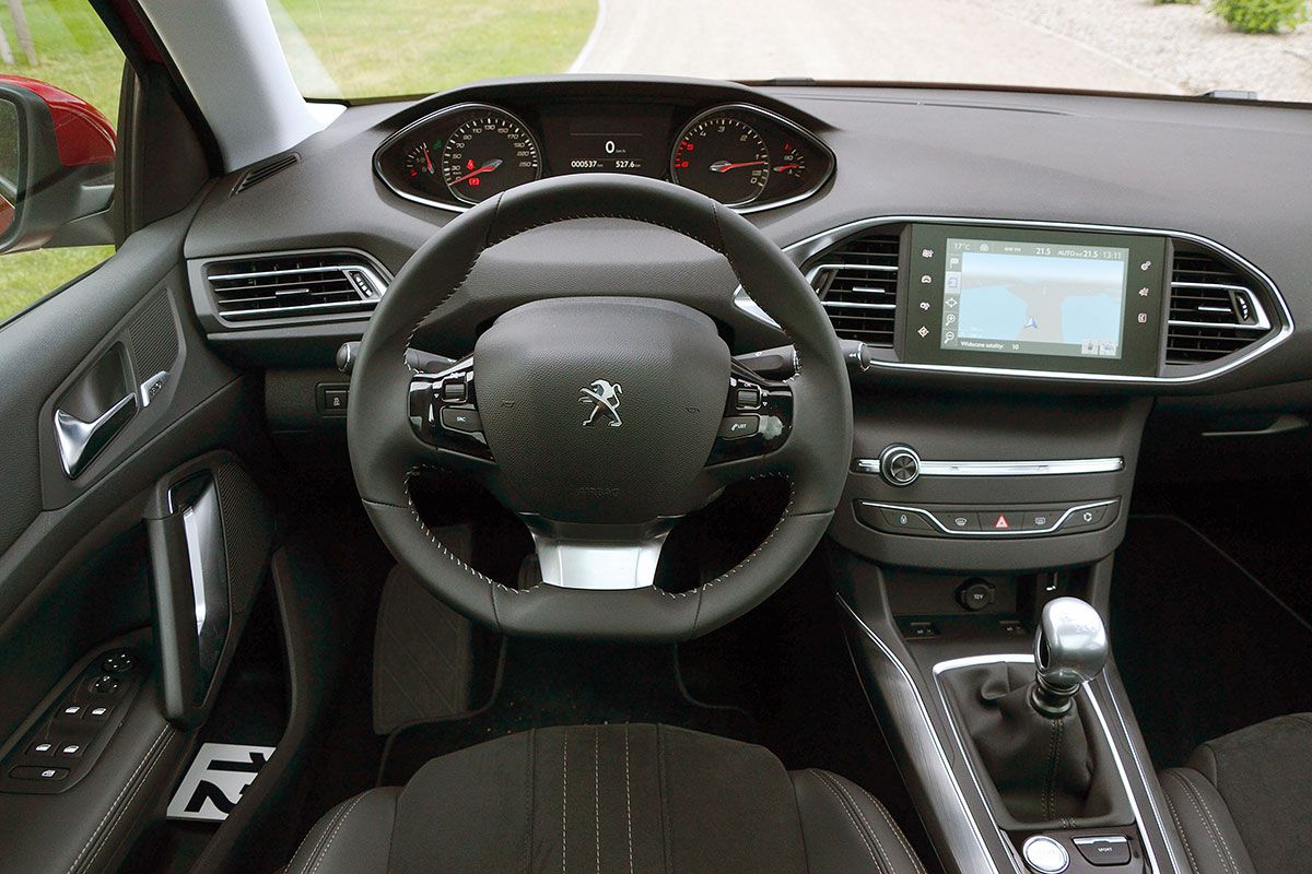 Ponadprzeciętnie dobrze jak na segment C prezentuje się kabina Peugeota, zwłaszcza w bogatszych wersjach. Jest tu przytulnie i otaczają nas niezłej jakości materiały. Konstruktorzy Peugeota zastosowali w kabinie oryginalny zestaw wskaźników umieszczony w polu widzenia kierowcy tuż nad niewielką kierownicą. Patent ten Peugeot zastosował już w modelach 208 i 2008. W zestawie zegarów intryguje nienaturalny bieg wskazówki obrotomierza, która wraz ze wzrostem obrotów wędruje od prawej do lewej. Docenimy za to położenie drążka zmiany biegów, który jest wygodnie umieszczony na wysokiej konsoli środkowej. W centralnej części deski rozdzielczej zamontowano naciskowy (a nie dotykowy) ekran LCD o przekątnej 9,7 cala (standard od drugiego poziomu wyposażenia), za pomocą którego możemy obsługiwać m.in. klimatyzację, radio i nawigację. Przełączanie między kolejnymi ekranami w celu dokonania zmian ustawień wymaga wprawy i odrywania wzroku od jezdni w stopniu większym niż przy zastosowaniu klasycznych rozwiązań. Francuzi pomyśleli co prawda o montażu w samochodzie gniazda 230V czy też obszernych schowków, ale kompletnie zapomnieli o sensownych uchwytach na kubki.