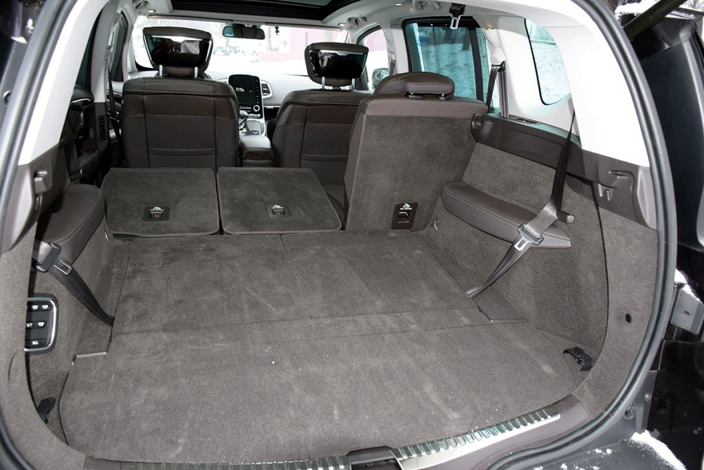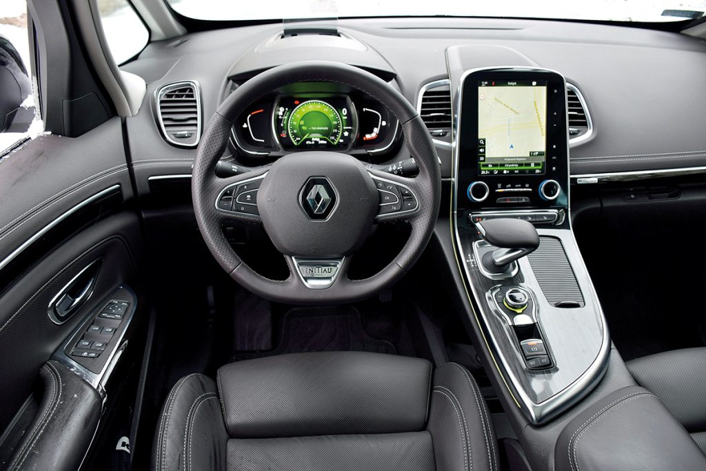W topowej wersji Initiale Paris trudno mieć zastrzeżenia do materiałów, z których wykonano wnętrze, jak też do samego montażu. Po wejściu wita nas specjalna animacja i sygnał dźwiękowy, a po włączeniu silnika poszczególne instrumenty (zestaw zegarów, środkowa konsola, pokrętła) ulegają podświetleniu. Na mocno rozbudowanej środkowej konsoli w górnej części zamontowano pionowo 8,7-calowy ekran dotykowy systemu multimedialnego a pod nim dźwignię zmiany biegów dwusprzęgłowej skrzyni EDC o kształcie przywodzącym na myśl drążek sterowy samolotu. Pod rozbudowaną środkową konsolą znajdziemy jeszcze przestrzeń na drobne przedmioty. Niestety, w specjalnych wnękach trudno zmieścić wyższe kubki, które opierają się pod kątem o dolną część środkowej konsoli. W rezultacie po ruszeniu autem łatwo mogą się one przewrócić i poparzyć, np. gorącą kawą, stopy. Praktycznym udogodnieniem w Espace jest montaż gniazd 12 V w trzech rzędach foteli, a w pierwszych dwóch także podwójnych wejść USB.