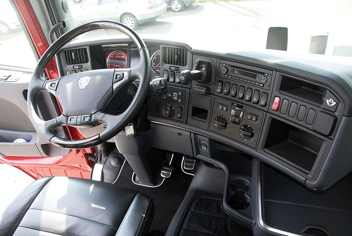 Dla Scanii od zawsze liczy się jedynie waga ciężka – powyżej 16 ton. Nowy silnik to także odnowiona kabina. Typowa dla Scanii zaokrąglona wokół miejsca kierowcy konsola dowodzenia mieści wiele uporządkowanych przełączników pokładowych. Mimo licznych funkcji w tak bardzo skomputeryzowanej ciężarówce, nie odczuwamy pokusy sprawdzania, co włącza każdy z przycisków, a potem przez dziesięć następnych kilometrów pstrykania innymi, aby sprawdzić, którym się to wszystko wyłącza. Obsługa instrumentów odbywa się intuicyjnie i dyskretnie przełącznikami z koła kierownicy bez odrywania od niej rąk. Wykończenie wnętrza przytłacza przepychem niczym w kabinie luksusowej limuzyny. Skórzane obicia drzwi, kierownicy i foteli, ciemne tony barw elementów imitujących drewno. Nawiązujące do sportowego ducha rywalizacji metalicznie połyskujące pedały: gazu i hamulcowego, czy też wszystkie funkcje motoryczne pojazdu do jazdy do przodu i do tyłu skupione w jednej małej dźwigience. Plastik tutaj też jest. Ba, całe połacie czarnych powierzchni plastikowych. Ale tworzywo jest gładkie i łatwe do utrzymywania w czystości, a jego elastyczność sprawia, że nic nigdy tu nie zatrzeszczy. Zestaw zegarów z kolorowymi wyświetlaczami to ukłon w stronę nowoczesności, gdzie jak w soczewce skupione zostały lotnicze tradycje marki przeplatające się z motoryzacją. Mamy zatem szereg elektronicznych skali uzupełnionych przez tradycyjne cyferblaty z analogowymi wskazówkami. Siedzi się w niesamowicie wygodnych fotelach, których profil zapewnia niezłe trzymanie boczne – zupełnie jak w sportowej osobówce. Tam jednak nigdy nie znajdziecie aż tylu możliwości ustawienia, podpompowania czy podgrzewania siedziska co tu. W wolnej chwili kierowca może, nawet nie wychodząc z kabiny, leniwie spojrzeć na wskaźniki kontrolujące ciśnienie powietrza w ogumieniu ciągnika. Gdzie nie spojrzysz, wszędzie widzisz emblemat „V8”. Zupełnie tak, jakby bez niego pojazd jeździł wolniej, gorzej. To cały duch tej maszynerii.