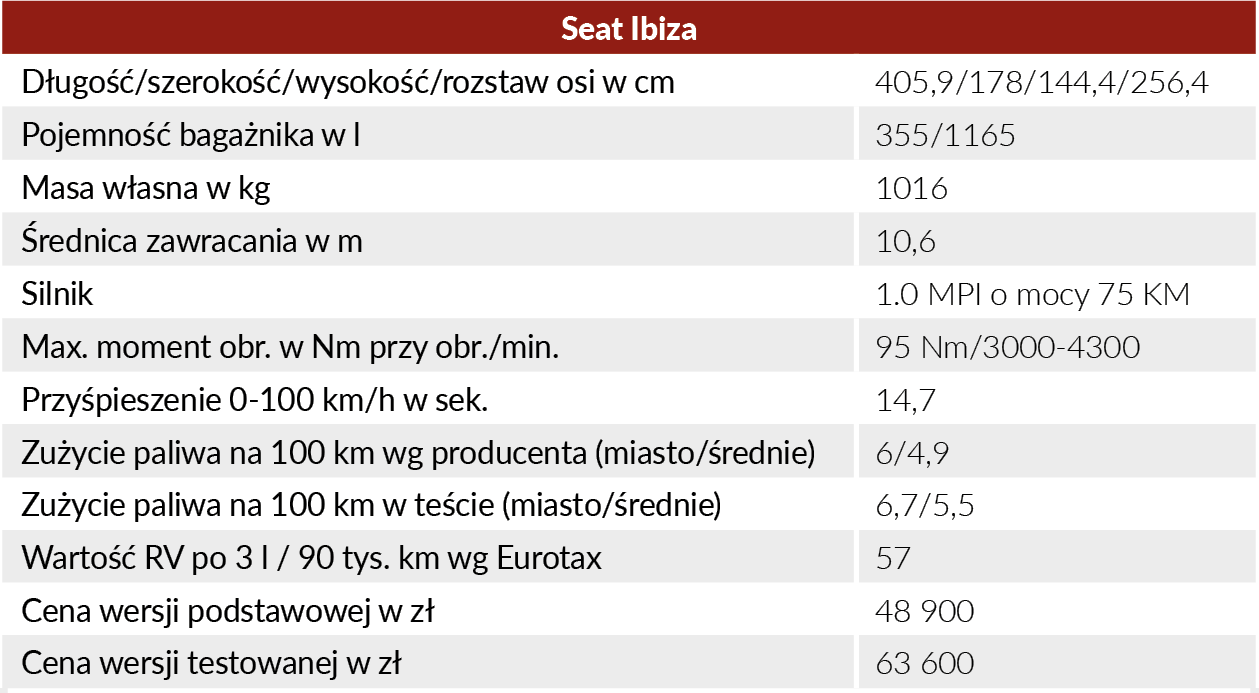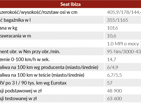 Ibiza oferuje zbliżony poziom cen do konkurentów, kosztując w najtańszej wersji Reference od 48,9 tys. zł. W wyposażeniu znajdziemy m.in. klimatyzację i radio z USB. W testowanej wersji Style (od 51,4 tys. zł) cenę mocno podbija wyposażenie opcjonalne. Na przykład nawigacja z ekranem dotykowym kosztuje 3533 zł, kolejne tysiące złotych dopłacimy za kamerę i czujniki cofania, felgi aluminiowe, opcjonalny lakier czy klimatyzację automatyczną, co podnosi cenę do ok. 64 tys. zł. Spora kwota jak za samochód segmentu B z najsłabszym silnikiem. Z drugiej strony, w zamian otrzymujemy naprawdę dopracowany pojazd, z pełnym wyposażeniem w zakresie bezpieczeństwa oraz wzorcowym prowadzeniem i właściwościami jezdnymi.
