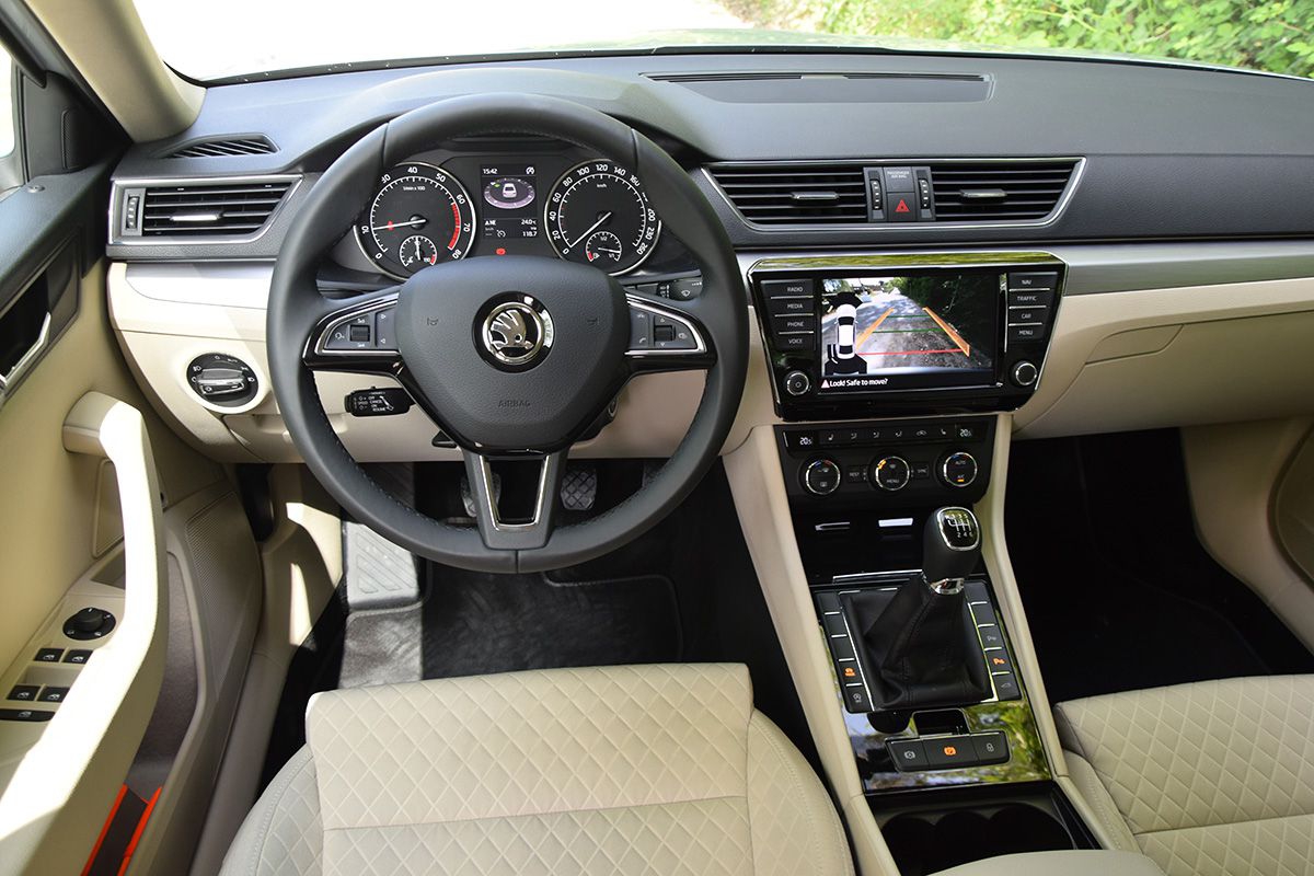 Nadrzędnymi hasłami przy tworzeniu wnętrza Superba, podobnie zresztą jak innych modeli Škód, były porządek i ergonomia. Deska nie jest przeładowana przełącznikami, a mimo to dostęp do wszystkich istotnych funkcji jest prosty i intuicyjny. Na pochwałę zasługuje czytelność zegarów, wyprofilowanie kierownicy, wyprofilowanie i wygoda przednich foteli, a przede wszystkim jakość materiałów i wykończenie kabiny. Najlepsze wrażenie robi jednak wnętrze w jasnych tonacjach. Producent zrezygnował z montażu klasycznej dźwigni hamulca ręcznego na rzecz przycisku elektrycznego hamulca postojowego. Nowinką w Škodzie, ale i w ogóle w segmencie, jest mocowanie na tablet umieszczone w składanym podłokietniku, które może wyraźnie podnieść komfort pracy podróżujących tym autem pasażerów. Producent pomyślał o montażu po jednej parasolce w obu przednich drzwiach. Zimą może się również przydać skrobaczka do szyb umieszczona pod klapką wlewu paliwa. Przydatnych drobiazgów jest w Superbie znacznie więcej, np.: mechanicznie odchylany zaczep holowniczy, miejsce na tablet w schowku przed pasażerem, złącze USB i gniazdo 230-woltowe w kabinie z tyłu, siatkowe kieszenie na wewnętrznych bokach foteli, wyjmowana latarka LED na boku bagażnika czy zabezpieczenie przed zatankowaniem niewłaściwego paliwa. W topowej wersji Škody możemy korzystać z Internetu LTE, a komfort podniesie nam trzystrefowa klimatyzacja czy też elektrycznie sterowane panoramiczne okno dachowe.
