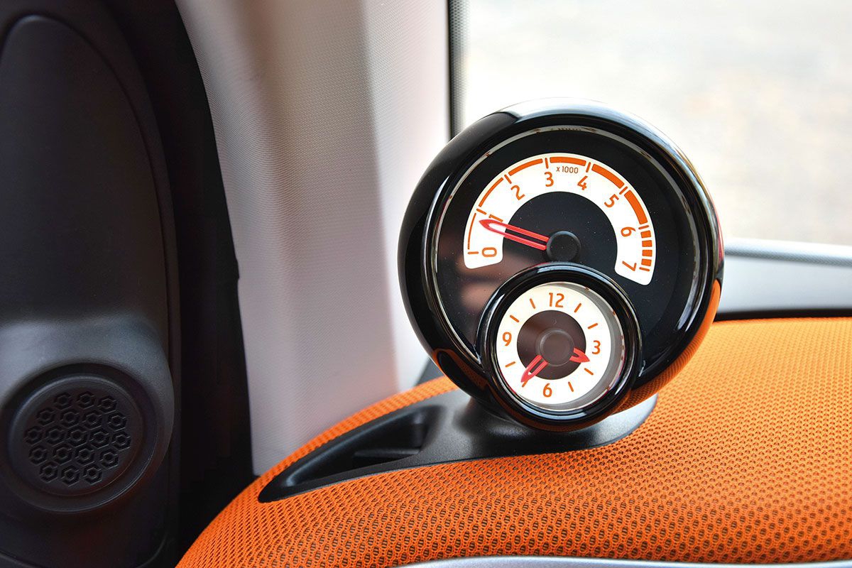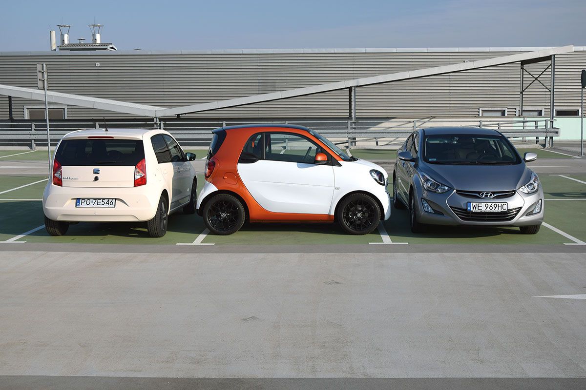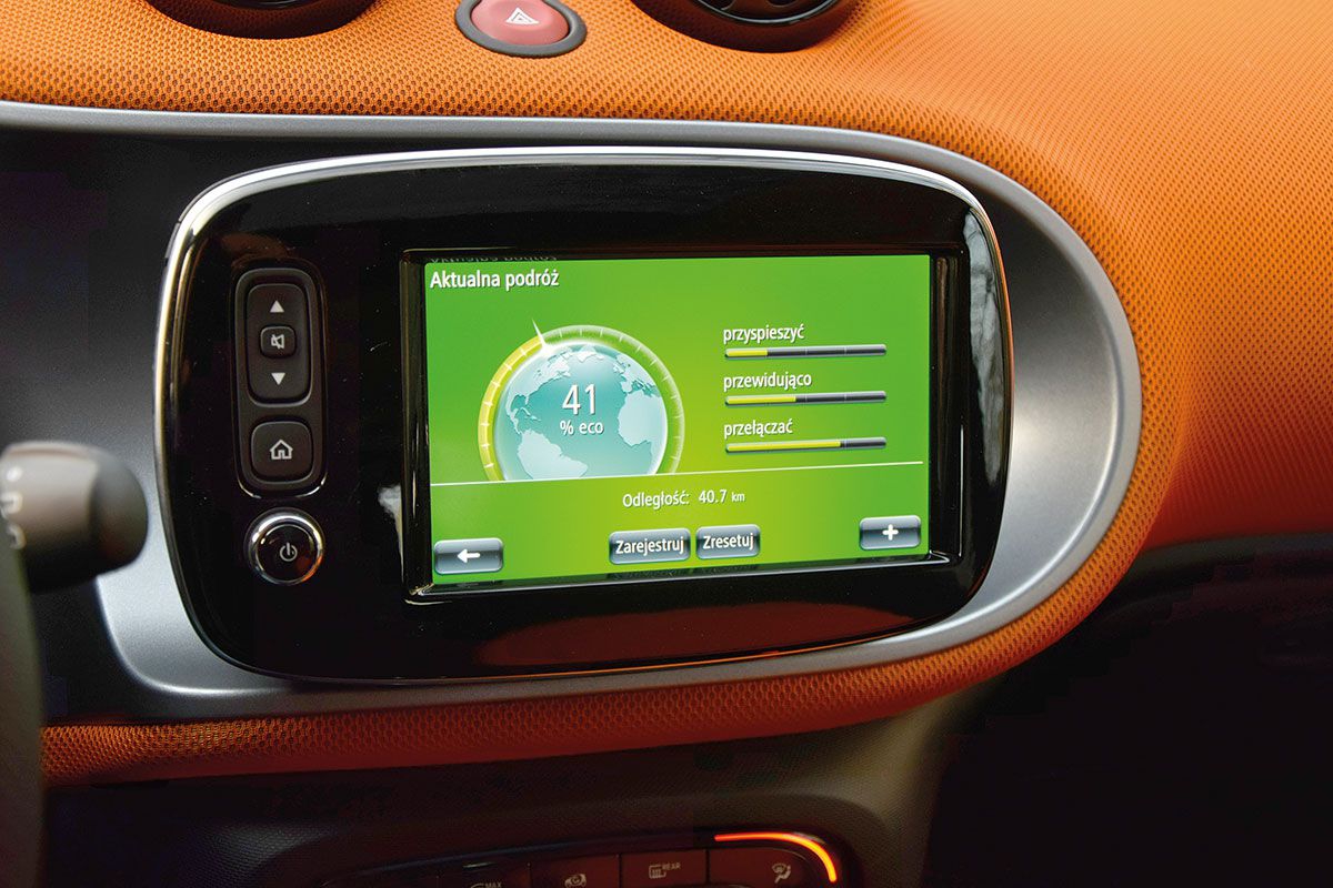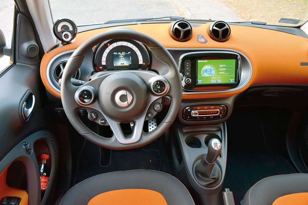 W kabinie Smarta nie czujemy, że mamy do czynienia z małym samochodem, co jest zasługą nie tylko wspomnianej ponadprzeciętnej wysokości (Smart jest wyższy o 6 cm niż Škoda Citigo!), ale też szerokości. Jego 166 cm to wynik lepszy o 2 cm niż w przypadku Citigo i Pandy oraz 6 cm lepszy niż w Smarcie drugiej generacji. Przy tak obszernej kabinie dla niektórych może być zaskoczeniem, że Smart kończy się tuż za fotelem kierowcy. Wnętrze Smarta w wersji Edition 1 uatrakcyjniają m.in. całkiem wygodne fotele z zintegrowanymi zagłówkami pokryte czarno-pomarańczową tapicerką. Uwagę zwraca trójramienna, sportowa kierownica pokryta skórą. Za kierownicą zamontowano duży, ale niezbyt czytelny, prędkościomierz, w którym mieści się rozbudowany komputer pokładowy. Opcjonalny obrotomierz i zegarek mogą być montowane w specjalnej kopułce po lewej stronie tuż przy słupku A. Szkoda, że kierownica regulowana jest tylko w jednej, pionowej płaszczyźnie. W wariancie Edition 1 dysponujemy również dużym centralnym wyświetlaczem multimedialnym, centralną konsolą z szufladą i podwójnym pojemnikiem na kubki, schowkiem na okulary, dodatkowym uchwytem dla pasażera, oświetleniem przestrzeni bagażowej oraz klamkami w kolorze matowego chromu.
