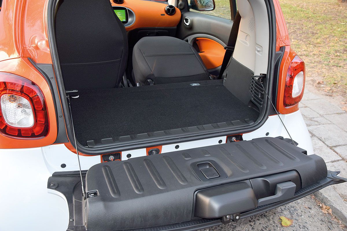 W niewielkiej przestrzeni, między oparciami foteli Smarta a dwuczęściową tylną klapą, wygospodarowano bagażnik o pojemności od 190 do 350 litrów. Można go dodatkowo powiększyć, wyjmując roletę i składając oparcie fotela pasażera. Wówczas możemy okazjonalnie przewieźć przedmioty o długości nawet 150 cm. Dwuczęściowa klapa tylna, złożona z unoszonej do góry szyby i opuszczanej na dół klapy, ułatwia korzystanie z bagażnika na zatłoczonych parkingach. Sam próg załadunku znajduje się dość nisko. Położony pod bagażnikiem silnik pochylono pod kątem 49 stopni, dzięki czemu udało się go obniżyć o 15 cm w stosunku do klasycznych jednostek. Po podniesieniu płyty wyściełającej podłogę bagażnika, zespolonej ze specjalną gąbką wytłumiającą hałas, ujrzymy metalową płytę zakrywającą silnik. Aby się do niego dostać, konieczne jest odkręcenie sześciu śrub. Równie osobliwy jest sposób otwierania maski z przodu. Jest ona odblokowywana za pomocą dwóch zatrzasków umieszczonych w atrapie chłodnicy. Po ich odpięciu tworzywowa klapa zdejmuje się w całości, ale nadal trzyma się ona na dwóch paskach. Pod tą maską nie znajdziemy dodatkowego bagażnika, ale np. zbiornik płynu do spryskiwaczy, chłodnicę, akumulator czy inne zbiorniki z płynami zasilającymi różne systemy.