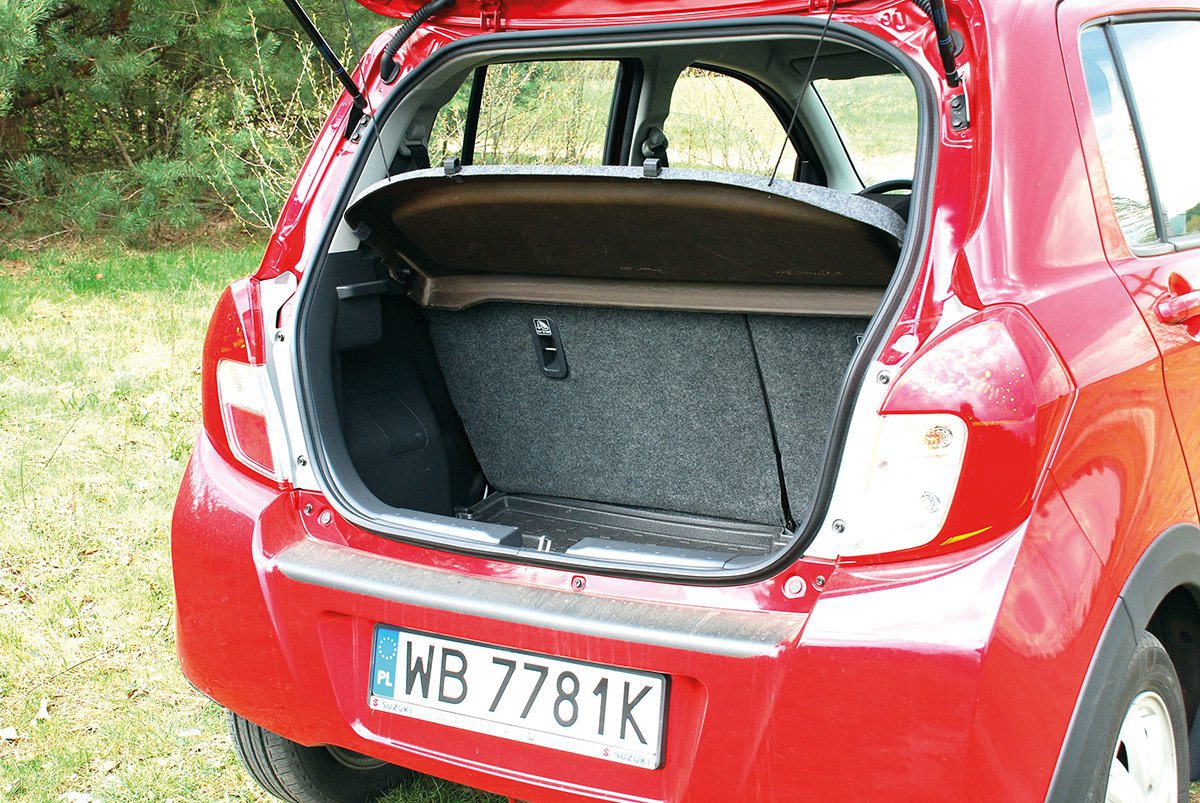 Funkcjonalność nadwozia to przede wszystkim łatwy dostęp do jego wnętrza. Mały Celerio ma pięcioro drzwi, boczne odchylane pod dużym kątem, a te w ścianie tylnej unoszone – odsłaniają otwór, przez który mamy dostęp do dużego bagażnika o objętości 254 dm3 (wg VDA). Tej objętości bagażnika nie osiągają niekiedy nawet samochody klasyfikowane o segment wyżej (B). Bagażnik Celerio można jeszcze powiększyć, składając dzielone (60:40) oparcie tylnej kanapy, wtedy uzyskujemy przestrzeń bagażową 726 dm3, mierzoną do dolnej krawędzi okien i maksymalną mierzoną do sufitu 1053 dm3. Po złożeniu oparć na siedzisko tylnej kanapy niestety tworzymy zróżnicowaną o około 20 cm dwupoziomową podłogę bagażnika. Pod tą podłogą jest przetłoczenie na nawet pełnowymiarowe koło zapasowe, ale w miejsce niego położono wątpliwej przydatności zestaw naprawczy do opon.